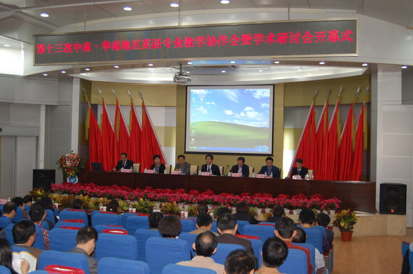 10月16日上午,由我校外国语学院承办的第十三次中南·华南地区2010年英语专业教学协作会暨学术研讨会在南校区圆形报告厅开幕。我校副校长周英,教育部英语教学指导委员会中南华南地区委员张庆宗教授、张维友教授、许明武教授、王宪生教授,外国语学院院长赵增虎教授等出席开幕式。开幕式由王宪生教授主持,来自中南华南地区近50 所高校的70余名专家、学者参加了会议。