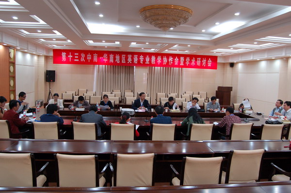 10月16日下午,第十三次中南·华南地区2010年英语专业教学协作会暨学术研讨会第二小组成员在我校南校区方形会议室展开了激烈地讨论。本次会议由郑州大学外国语学院副院长钱建成教授主持。