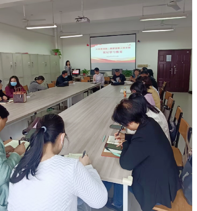 4月16日下午,大学英语第二党支部全体党员在文科综合楼308室集体学习了《中国共产党纪律处分条例》。