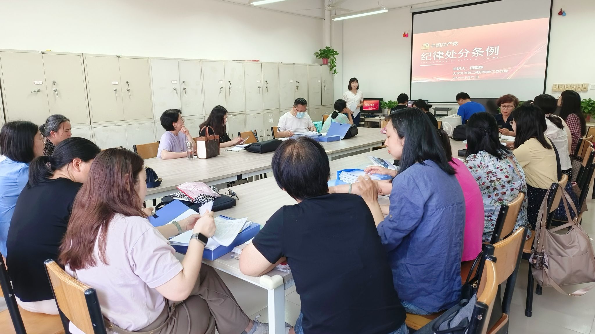 5月21日下午,大学英语第二教研室教工党支部书记在文综楼308室以“深入学习《中国共产党纪律处分条例》强化党的纪律建设”为题为支部全体党员上了一堂生动的党课,带领大家深入学习新修订的《中国共产党纪律处分条例》(简称《条例》),进一步提升了党员们的纪律意识和党性修养。