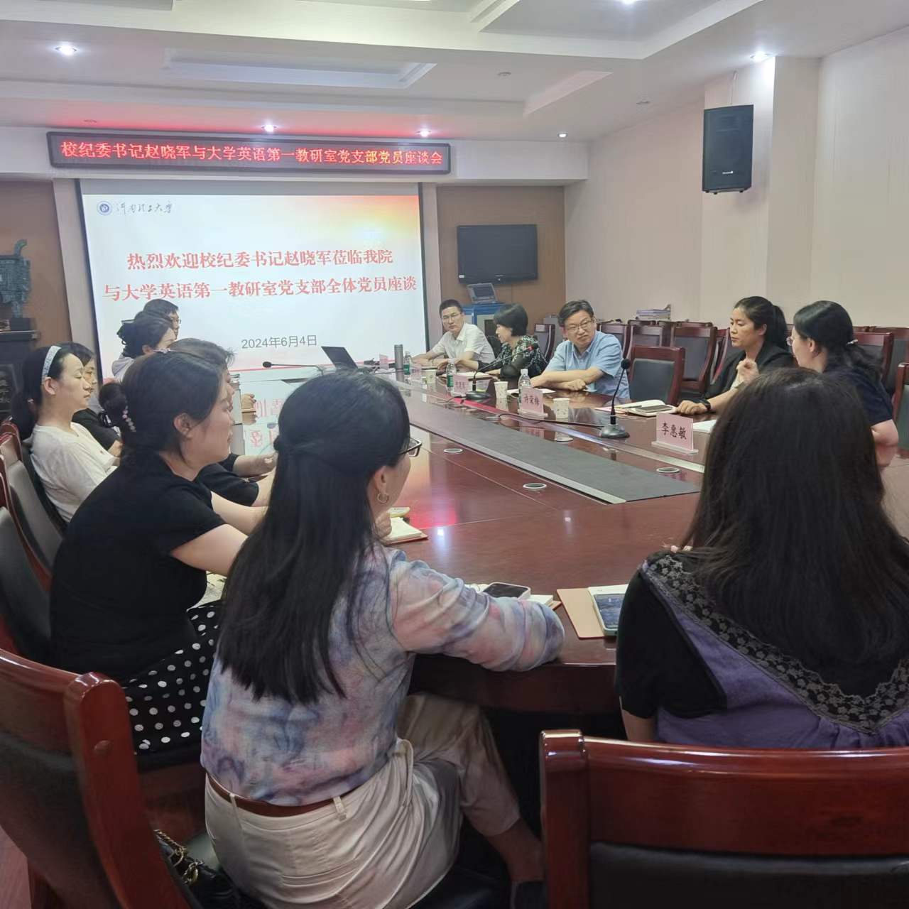 6月4日下午,校纪委书记赵晓军来到我院,与大学英语第一教研室党支部党员亲切座谈。校纪委综合室主任郭兰英、学院党委书记许荣梅、院长李惠敏、学院党委副书记何军一起参加了座谈。