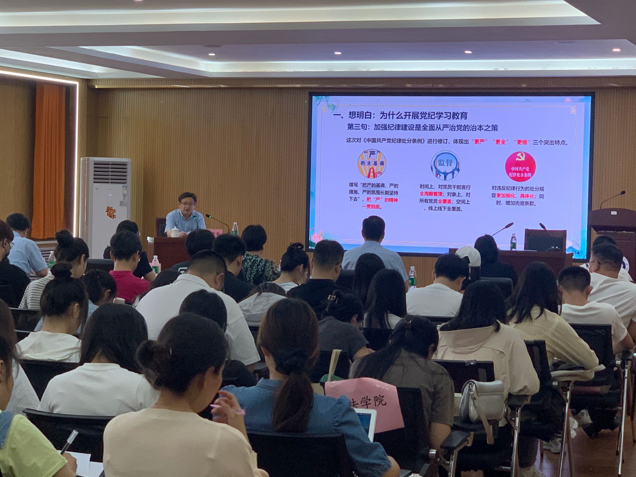 校纪委(专员办)机关有关同志,我院班子成员、党委委员、支部书记、系室主任、大学英语第一教研室党支部全体党员、学生党员代表,音乐学院党委书记、音乐表演2301班全体学生,文法学院研究生党支部全体学生党员一同聆听思政课。