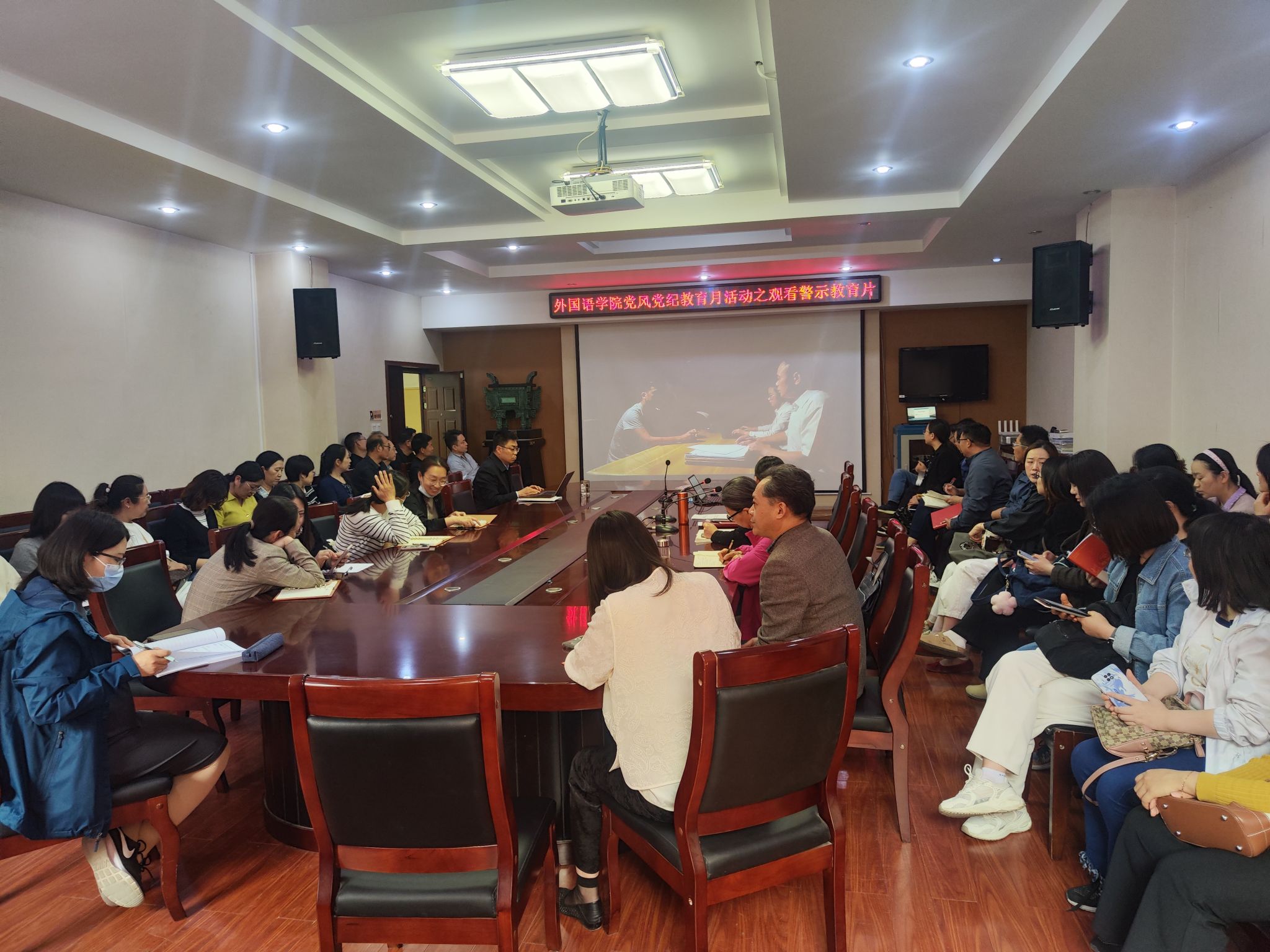 为深入学习贯彻《2025年党风党纪教育月活动方案》,扎实推进学校党风党纪教育月活动部署,4月15日下午,外国语学院党委在文综楼311会议室召开警示教育大会,组织全体教师党员集中观看廉洁教育微电影《如果人生可以重来》,并专题学习省纪委监委编印的违反中央八项规定精神典型案例。党委书记许荣梅主持会议并作警示教育讲话。