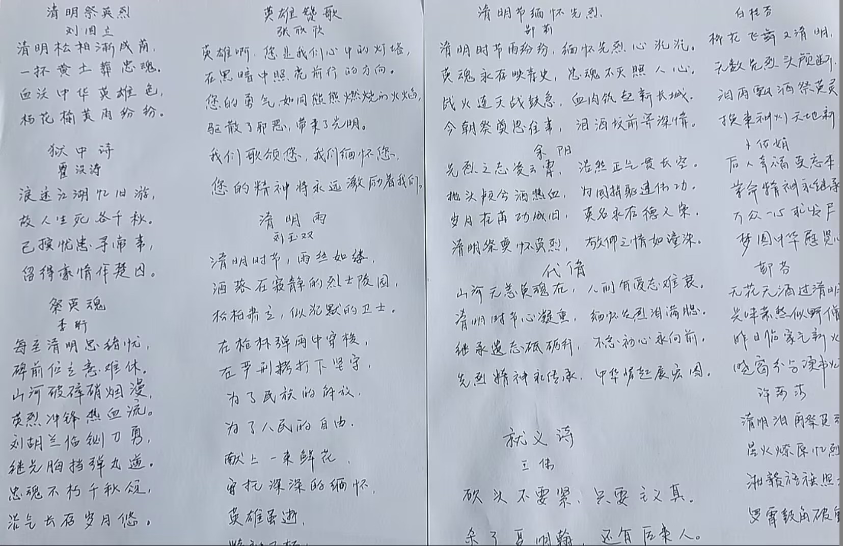 寄意寒星荃不察,我以我血荐轩辕。在那个战火纷飞的年代,革命先烈们用自己的血肉之躯缔造了新中国,开辟了我们今天的幸福生活。为了祭奠先烈,慰藉忠魂,支部党员们或创作或抄写诗词,缅怀革命前辈。“血沃中华英雄色,杨花榆荚雨纷纷。” “忠魂不朽千秋颂,浩气长存岁月悠。” “英魂永存映青史,忠魂不灭照人心。” “先烈精神永传承,中华崛起展宏图。”党员们读着这些诗句,一腔腔思念之情化作一句句铿锵之语,来告慰先烈们的在天之灵。