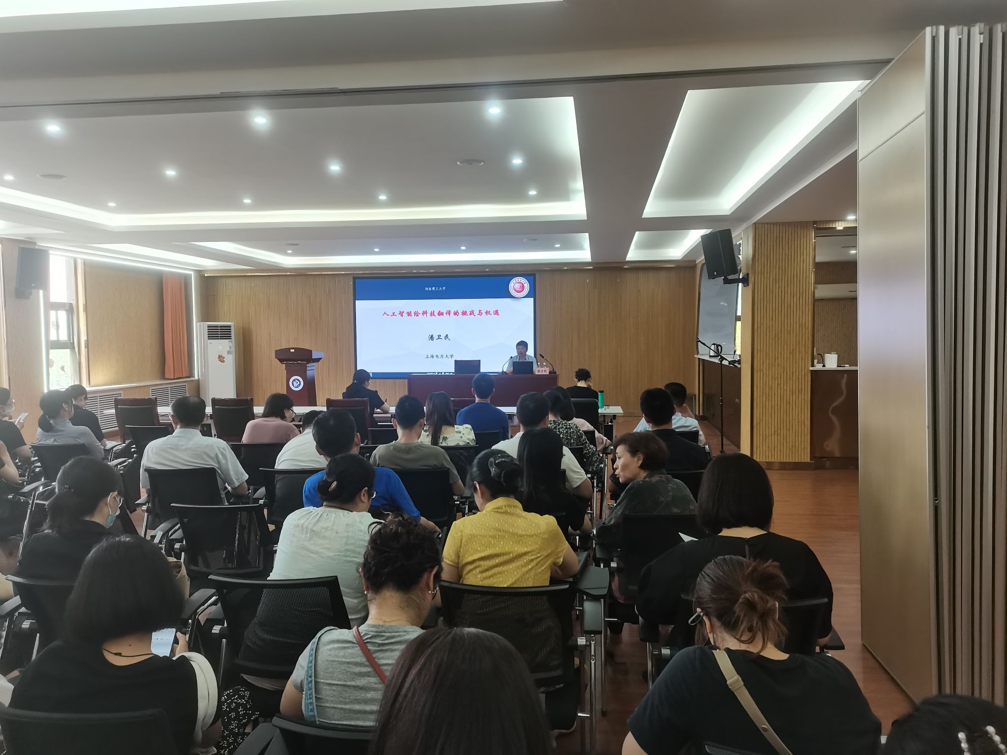 6月20日上午,应我院之邀,上海电力大学潘卫民教授在文综楼302室作了题为“人工智能给科技翻译的挑战与机遇”的学术报告。报告会由院长李惠敏主持,我院教师及部分翻译硕士研究生100余人参加。