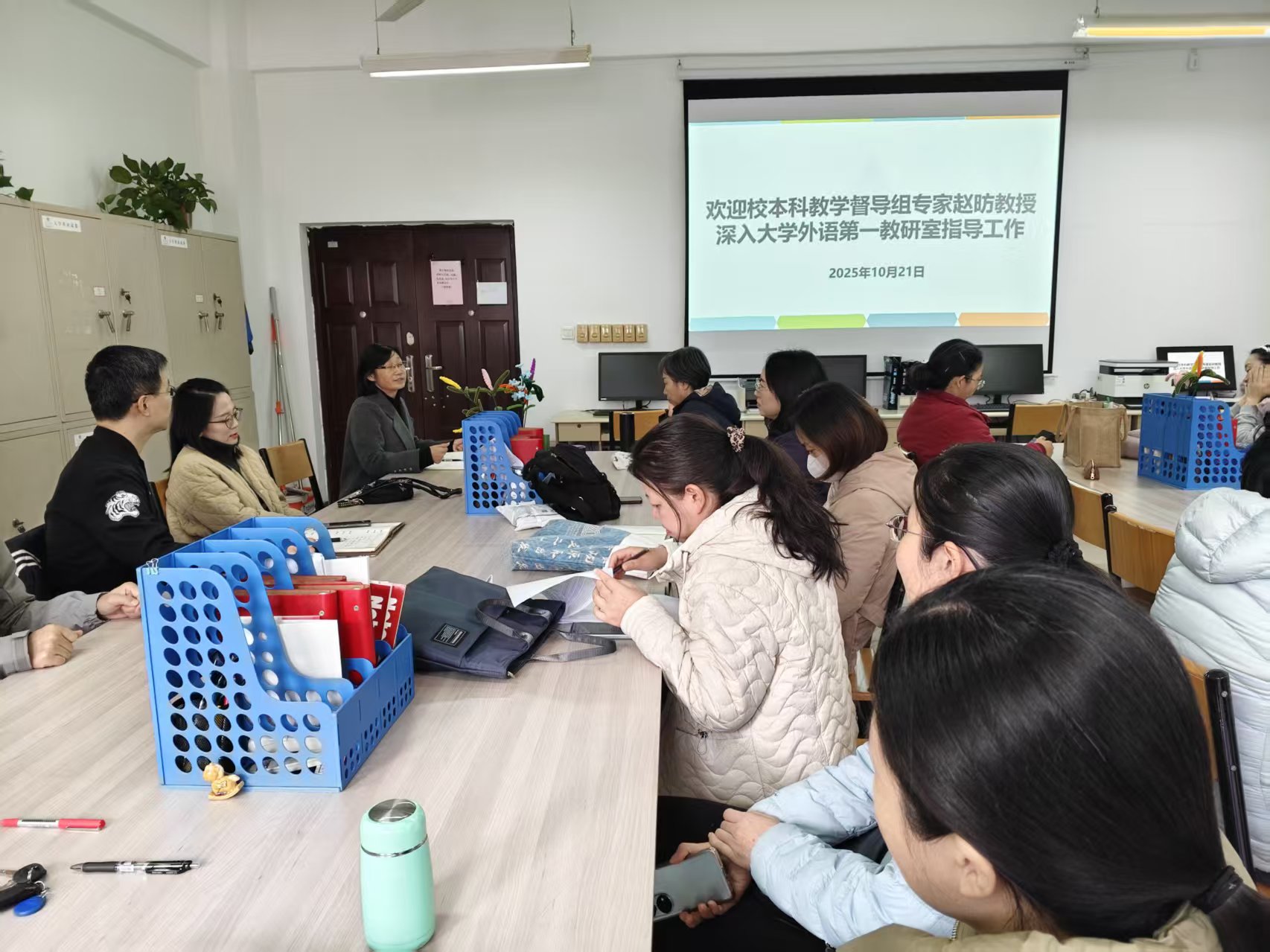 为深化教育教学改革,持续推进2025级大学英语教学改革,10月21日下午,大学外语第一教研室全体教师在文综楼309室齐聚一堂,顺利举行了2025-2026学年第一学期第三次集体备课教研活动。本次活动特邀校本科教学督导组专家赵昉教授莅临指导,教研室全体教师参与研讨。