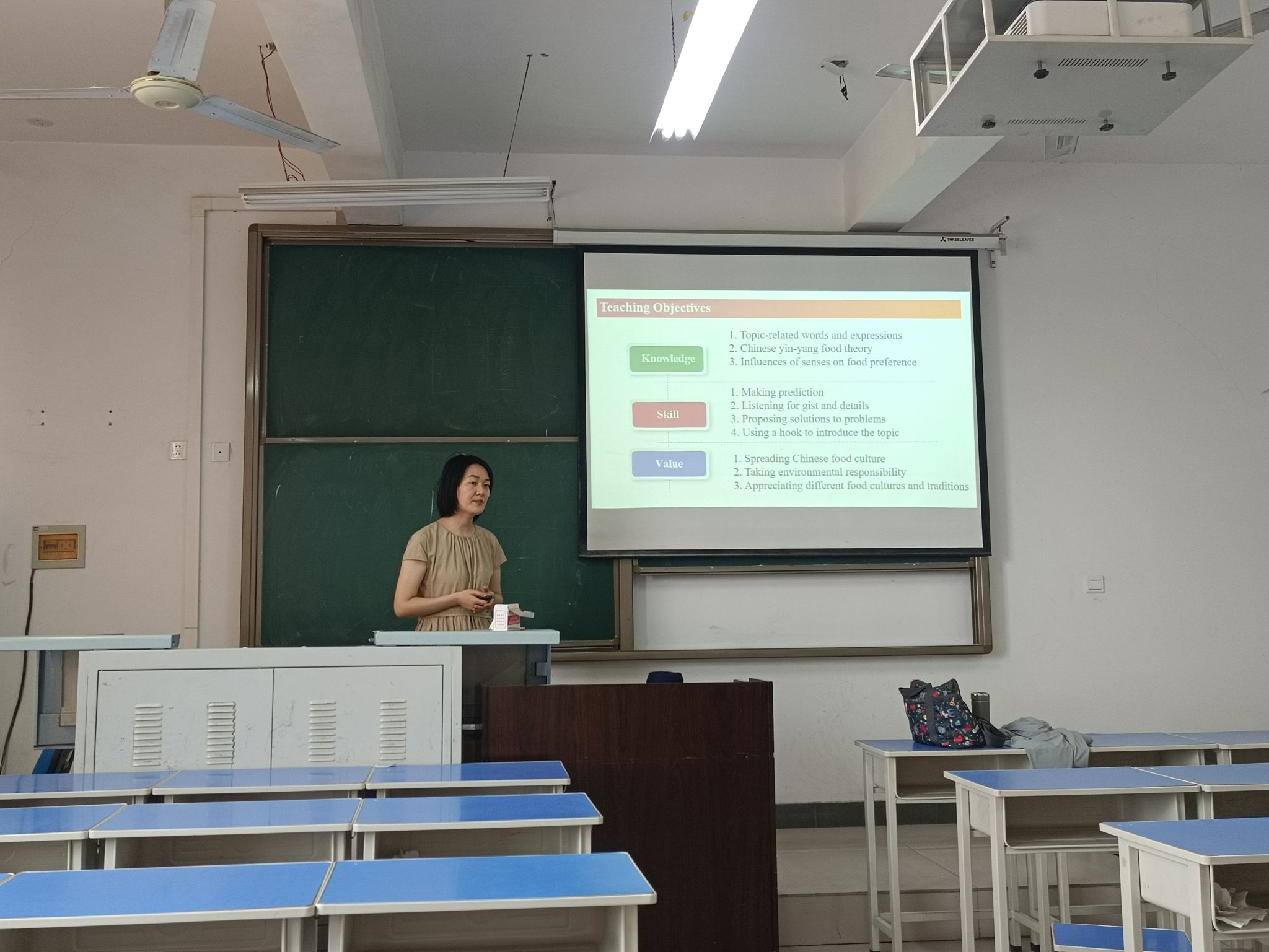 活动伊始,代倩进行模拟授课展示。代倩老师紧扣外语教学目标,精心设计教学环节,通过生动有趣的案例、互动性强的课堂活动,将语言知识与文化内涵巧妙融合,充分展现出扎实的专业素养和创新的教学理念。模拟授课结束后,评委们从教学内容设计、教学方法运用、课堂互动效果、教学语言表达等多个维度进行了细致入微的点评。她们既肯定了代倩老师在教学设计中的亮点与创新之处,也直言不讳地指出存在的问题与不足,并提出极具针对性的改进建议。例如:重新梳理教学内容,突出重点;对于教学互动环节,要更加注重学生的主体地位,增加互动的深度与广度。