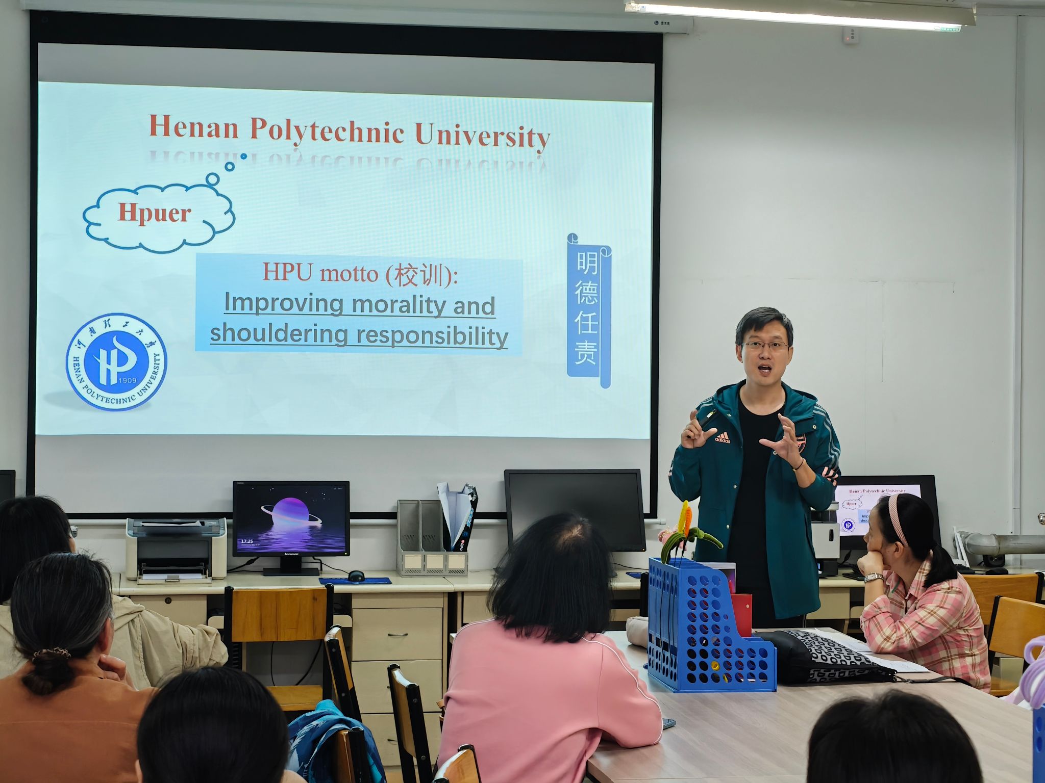 本次教研活动内容是大学英语导学课,余阳老师代表备课组进行了说课。导学课以习近平在中国共产党第十九次全国代表大会上的讲话中关于“加强中外人文交流,讲好中国故事”等内容为思政切入点,以“Why---What---How”为主线,为2025级学生详细介绍了为什么学英语、英语学什么、英语怎么学。同时,也给学生介绍了2025级大学英语改革、分级教学以及分级教学的内容,让学生也为大学英语改革后的教学做好准备。说课结束后,教研室老师们就课件内容和具体的教学环节开展了热烈的讨论并提出了一些可行的建议。
