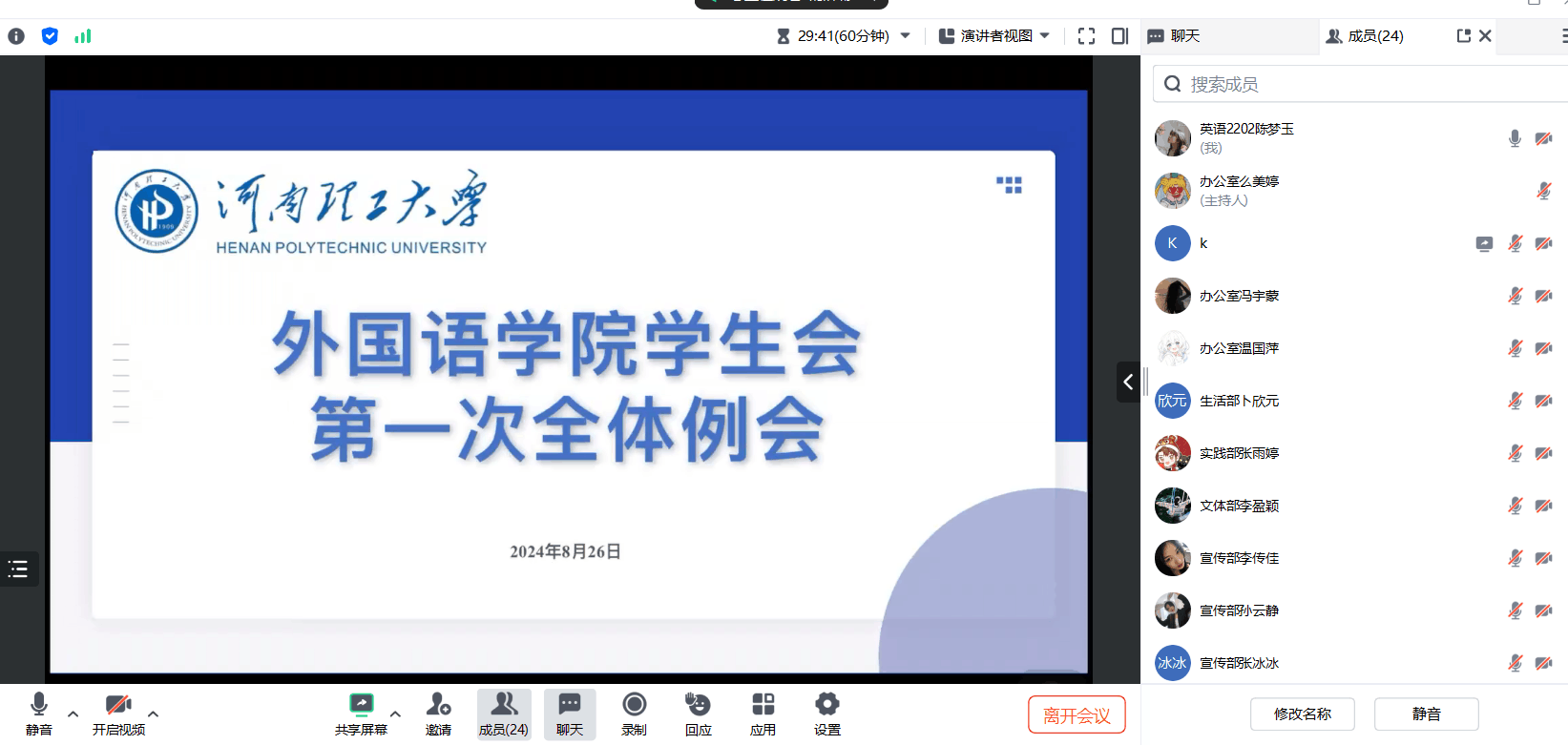 为全面回顾和总结暑期工作成果,明确未来的工作方向,8月26日,我院学生会通过线上腾讯会议召开2024年暑假学生会工作总结暨迎新工作部署会议,学生会全体成员参加,会议由学生会主席团陈梦玉主持。