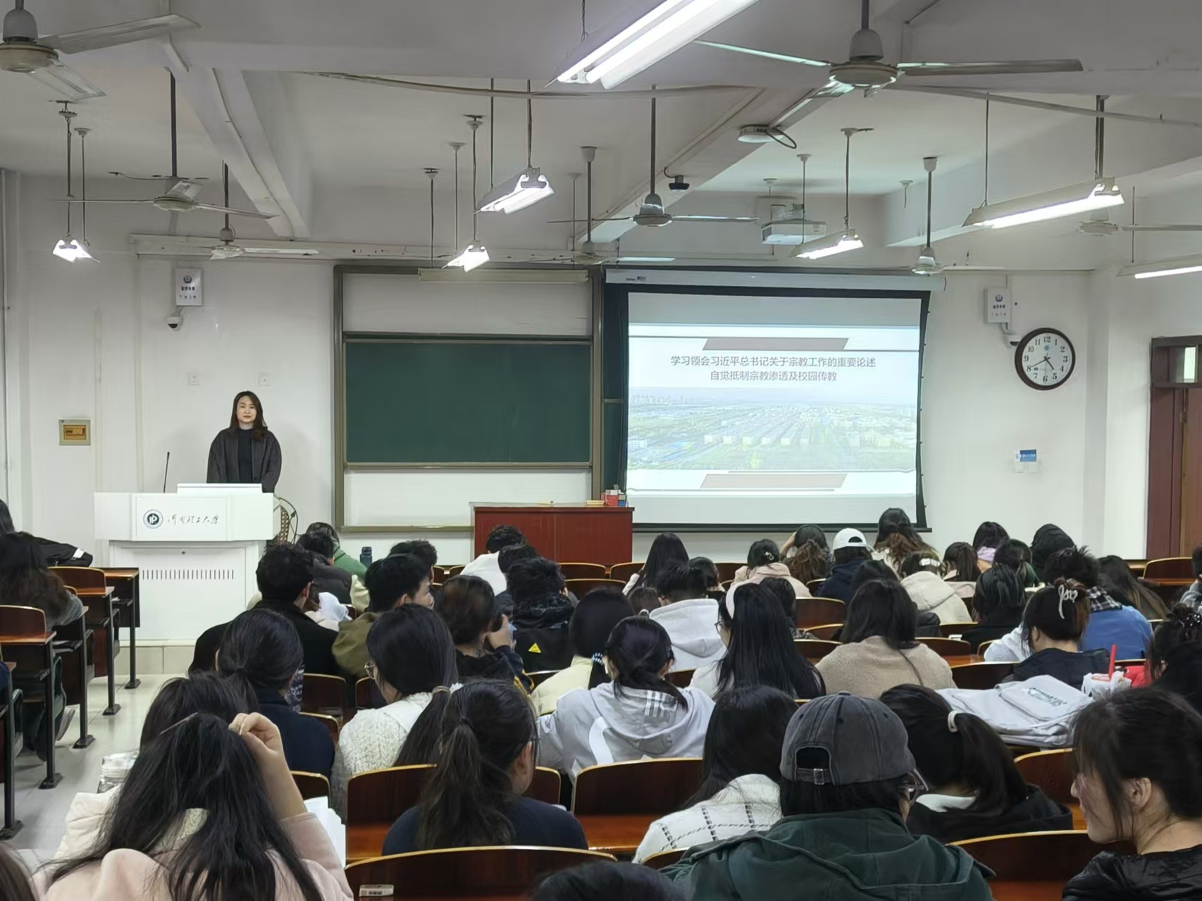 为深入学习贯彻党的二十届三中全会精神、党的宗教工作方针政策和关于宗教工作重要论述,掌握校园宗教工作管理的主动权,确保教育与宗教相分离。11月16日下午,我院在文综楼307开展关于“教育与宗教相分离,抵御宗教渗透校园”主题教育,学工办主任兼专职组织员王晓玲主讲,全体学生参与。