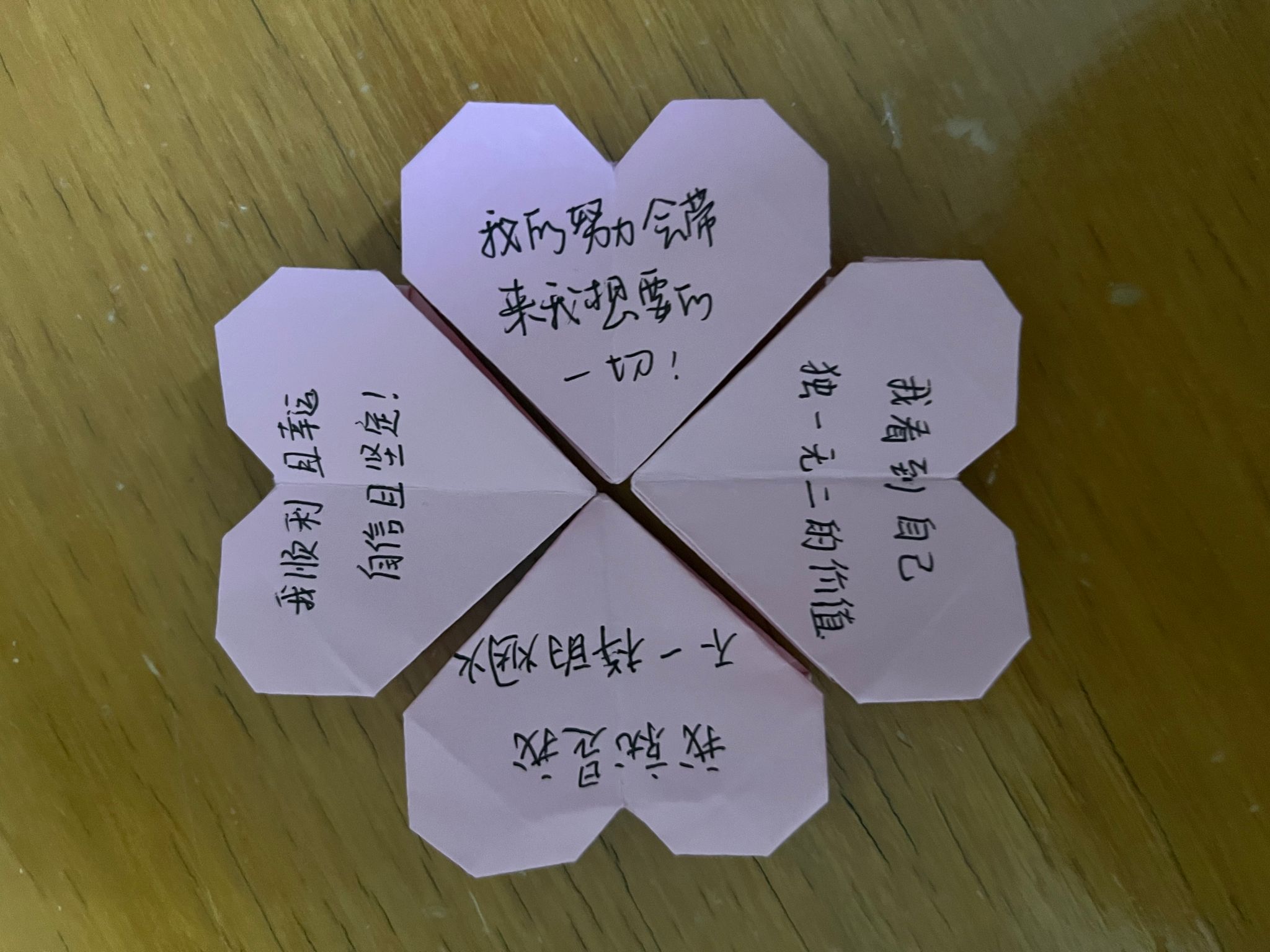 活动现场,学生们纷纷拿起手中的纸张,认真折叠成爱心形状。在折叠的过程中,他们不仅锻炼了自己的动手能力,更在心灵深处感受到了爱的力量。随后,学生们在爱心上写下了一句句充满正能量的自我鼓励话语,如“我的努力会带来我想要的一切”“我看到自己独一无二的价值”等。这些爱心不仅成为了学生们内心的寄托,也成为了他们相互鼓励、共同成长的见证。在分享环节,学生们纷纷展示自己的爱心,并分享了自己写下这些话语时的内心感受和想法。他们表示,通过这样的活动,他们更加深刻地认识到了自己的优点和长处,也学会了如何用积极的心态去面对生活中的挑战和困难。