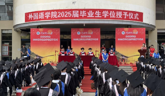 6月11日上午,河南理工大学外国语学院2025届毕业生学位授予仪式在文综楼前庄严举行。院党委书记许荣梅、院长李惠敏等全体领导班子成员、毕业班辅导员及教师代表共同见证这一重要时刻。仪式由院学工办副主任王晓玲主持。