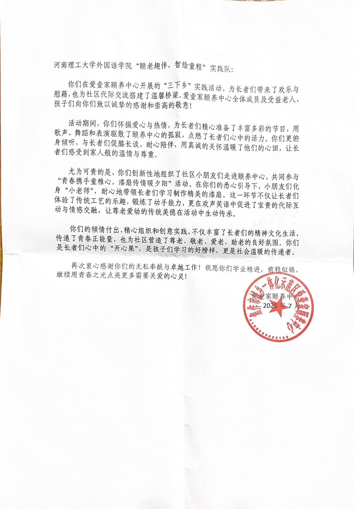 近日,我院“颐老趣伴,智绘童程”实践队接连收到来自理工大社区与爱壹家颐养中心的两封情真意切的表扬信,高度赞誉其在“三下乡”实践中服务“一老一小”的突出贡献。