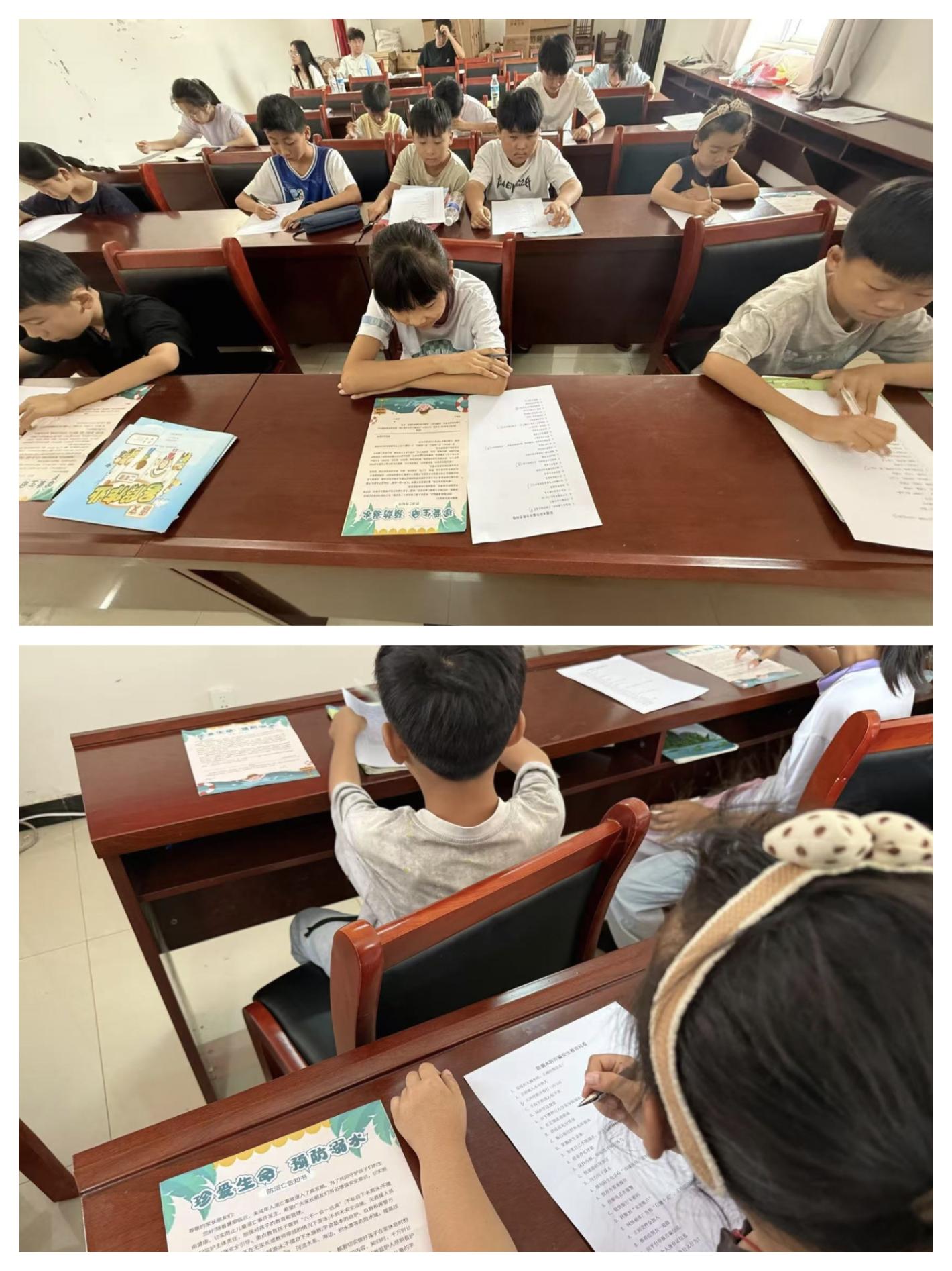 教室里,队员们带来的安全知识带着泥土的温度:图文手册上,防溺水板块用漫画画出“河边禁入”的红牌,配着“遇危险先呼救,不盲目下水”的乡语注解;防诈骗页面印着“中奖电话多猫腻,养老金袋要捂紧”的短句,旁边画着老人摆手拒绝的简笔画。讲解时,队员们指着图画问:“咱村小河边要是看到小伙伴玩水,该咋办?”孩子们抢着答:“喊大人!找竹竿!”互动问答里,“不私下水”“不信陌生话”的底线慢慢清晰。随后的情景测试中,“爷爷接到中奖电话该怎么做”“发现同伴落水先做什么”的问题,孩子们一笔一划写下答案,交上来的卷面上,对勾连成了线——100%的正确率,是安全知识真正走进心里的模样。