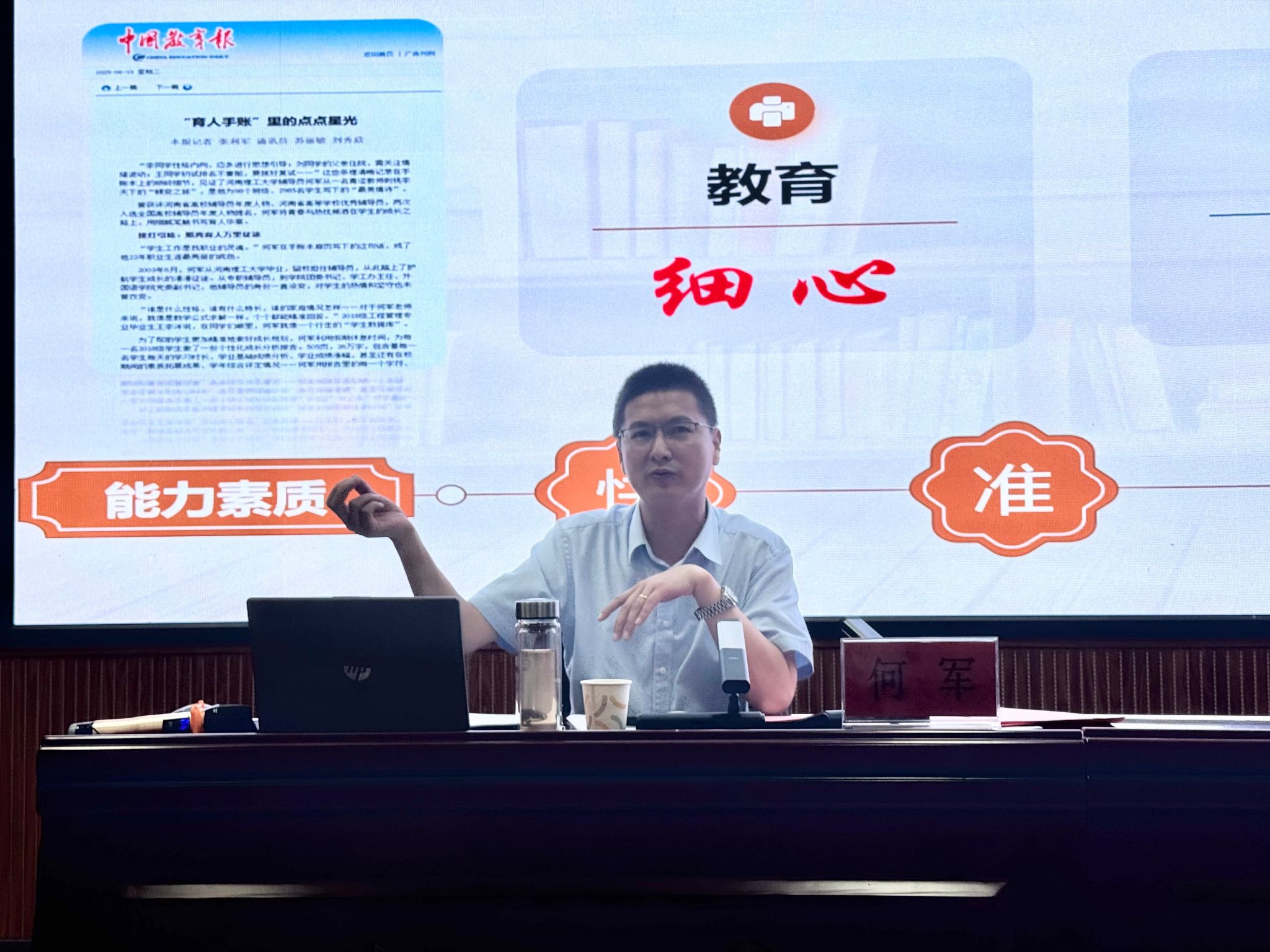 何军以《凝心聚力育新人,笃行实干谱新篇——新时代高校学生工作能力提升路径》为题,系统的回顾了自己的学生工作生涯,以普通高等学校辅导员的主要工作职责为主线,围绕“提灯引路:照亮育人万里征途”“织就星链:托举学生奔赴未来”“无声守护:滋养每颗种子成长”,分享了他的学生工作方略。何军希望大家在从事学生工作过程中,细心教育、用心管理、耐心服务,做到“快、准、稳、细、韧、活”,让自己成为雷厉风行的行动派、精准高效的导航仪、处变不惊的定盘星、滴水不漏的把关者、百折不挠的攻坚者、灵活应变的多面手,他期待与大家同心同向同行,把教书做职业,把育人做追求。