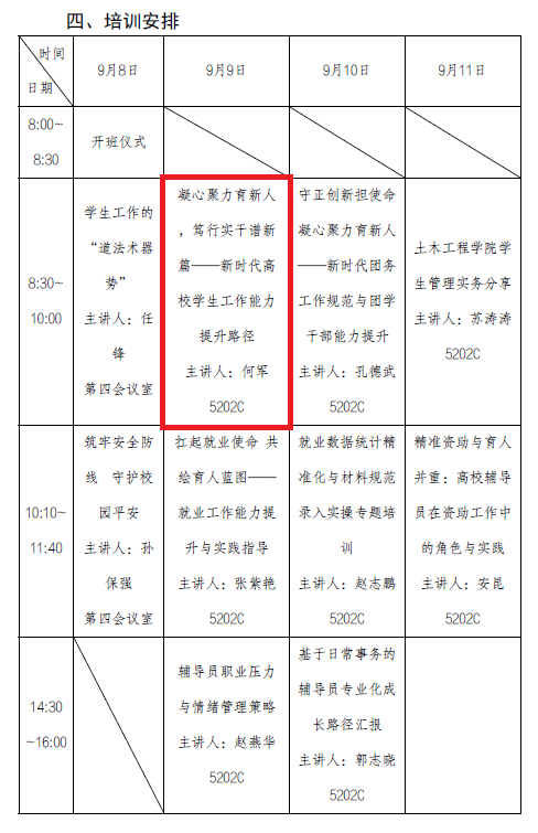 9月8日至11日,河南工业和信息职业学院2025年秋季学生管理工作队伍专题培训于该校第四会议室举办,我院党委副书记何军受邀为学员作专题报告,该校各二级学院书记、学生管理副院长、学生工作办公室主任及全体辅导员、新生班主任全员参与。