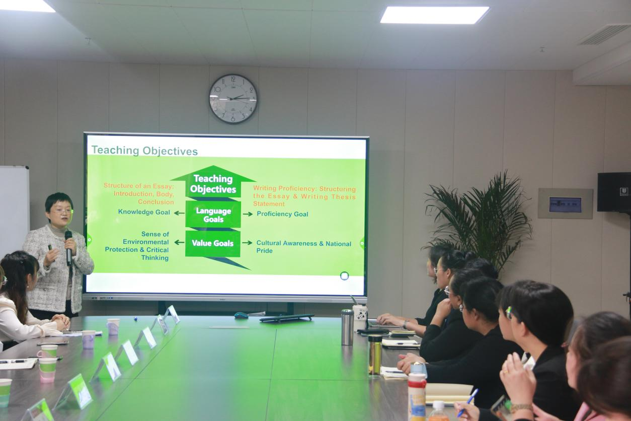 在教学展示环节中,温俊毅老师采用研究性教学模式,以“问-答引导式论点写作策略”为主题,呈现了一节高质量写作课的教学设计,展现了研究性教学对教师教学能力的提升作用。她通过层层设问引导学生主动思考,逐步掌握英语论说文写作的核心技巧,其独特的教学风格和清晰的教学逻辑,赢得了现场专家和教师的一致好评。
