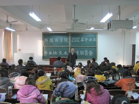 2011年12月23日,外国语学院2012届毕业生论文及实习动员大会在文科综合楼407举行,外国语学院院长、副书记、教学副院长、系主任、毕业班辅导员及2012届全体毕业生出席了本次会议。会议由郑忠耀副院长主持。