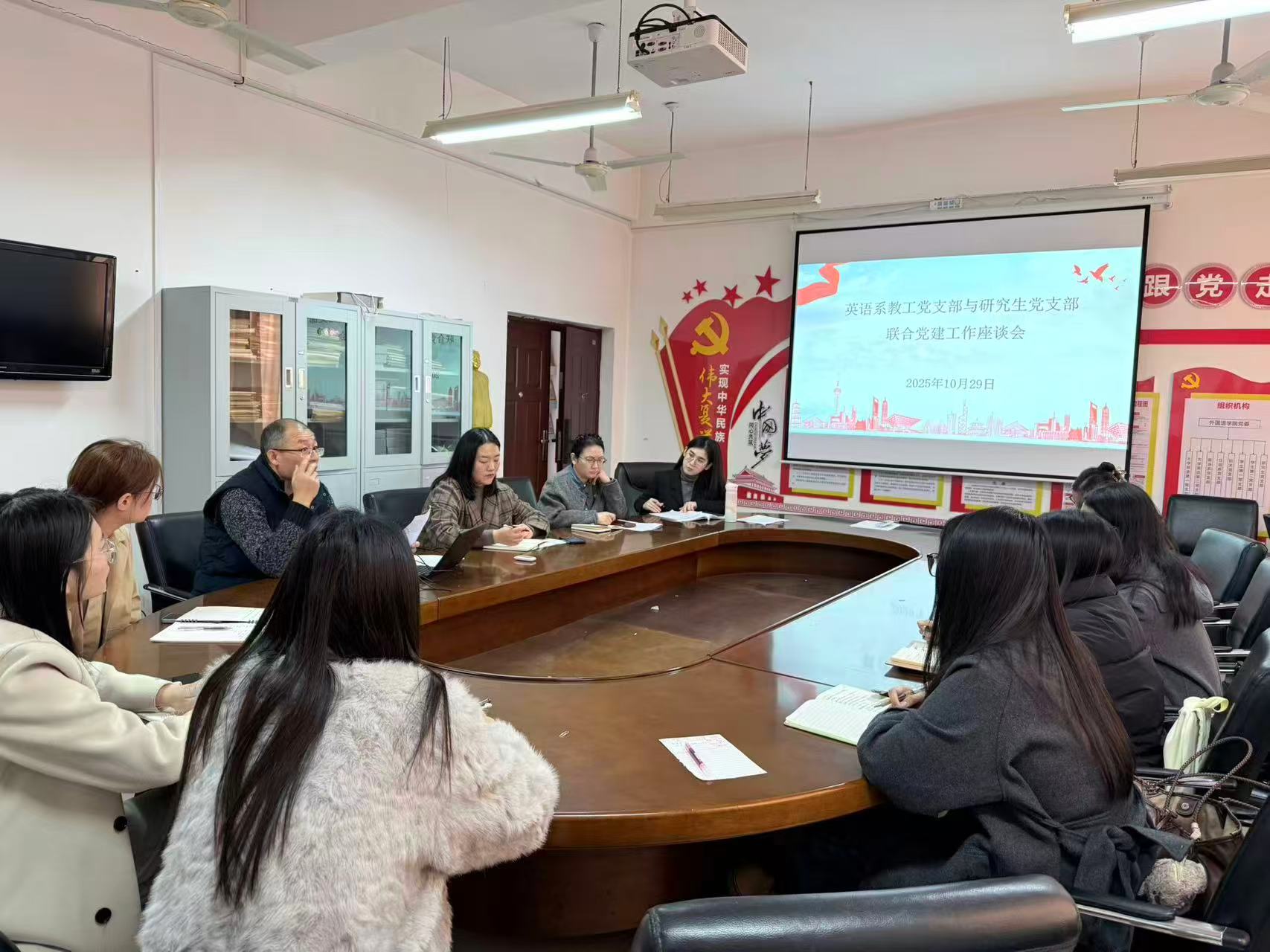 为进一步发挥党建引领作用,强化师生党员思想交流与科研协作,2025年10月29日上午,英语系党支部与研究生党支部在文综楼318会议室开展了共创共建活动。英语系党支部党员代表和研究生党支部党员代表参加。活动由英语系党支部书记孙强主持。