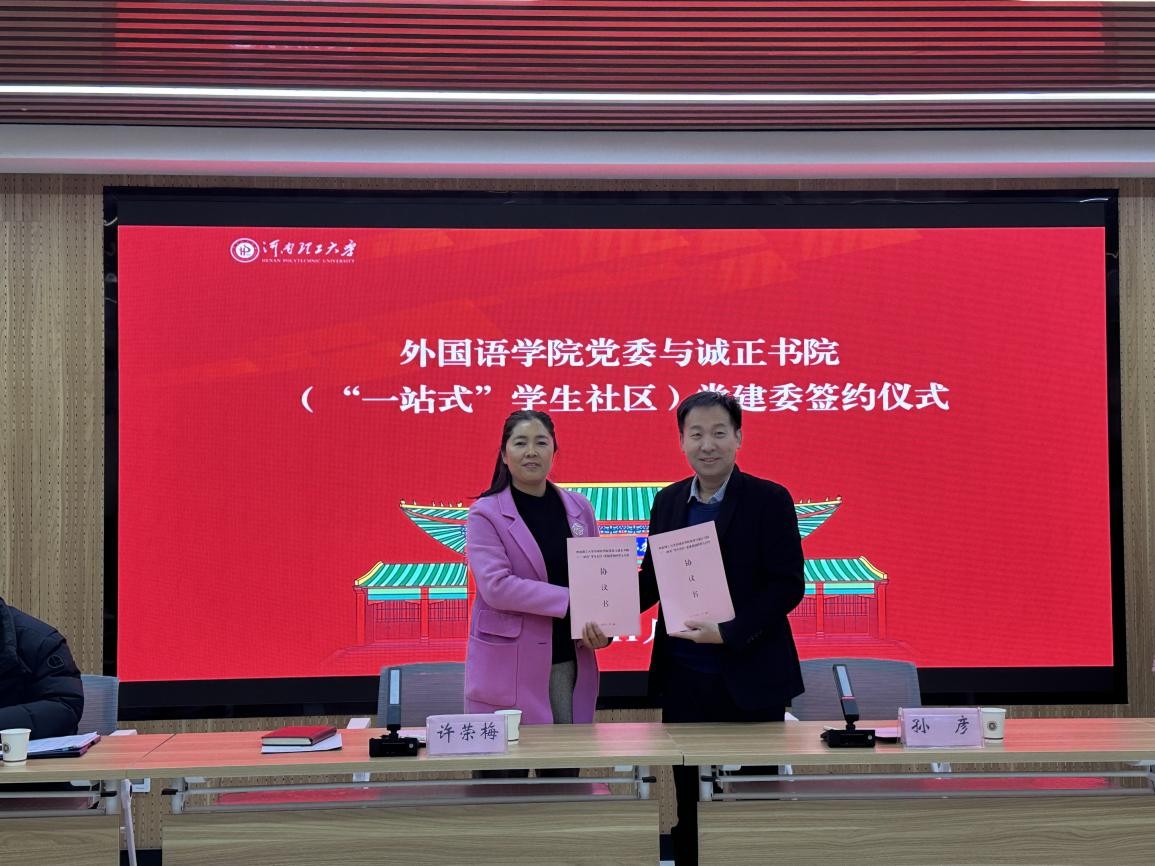 仪式上,许荣梅介绍了我院在人才培养、学科建设及“党建+外语”特色育人品牌建设方面取得的成果。她指出,双方将以此次合作为契机,充分发挥外国语学院的专业优势与“一站式”社区的平台育人优势,围绕党组织共建、外语氛围营造、育人机制研究等方面协同发力,共同构建“外语+社区”育人新生态。孙彦表示,“一站式”学生社区将充分发挥贴近学生的独特优势,与外国语学院协同推进文化浸润与理想信念教育,切实帮助学生提升语言实践能力、拓展国际视野、筑牢理想信念根基,助力双方高质量发展。在全体与会人员的共同见证下,双方代表正式签署协同育人合作协议,孙彦代表诚正书院(“一站式”学生社区)党建委聘任许荣梅为“党建育人导师”、何军为“思政育人导师”。