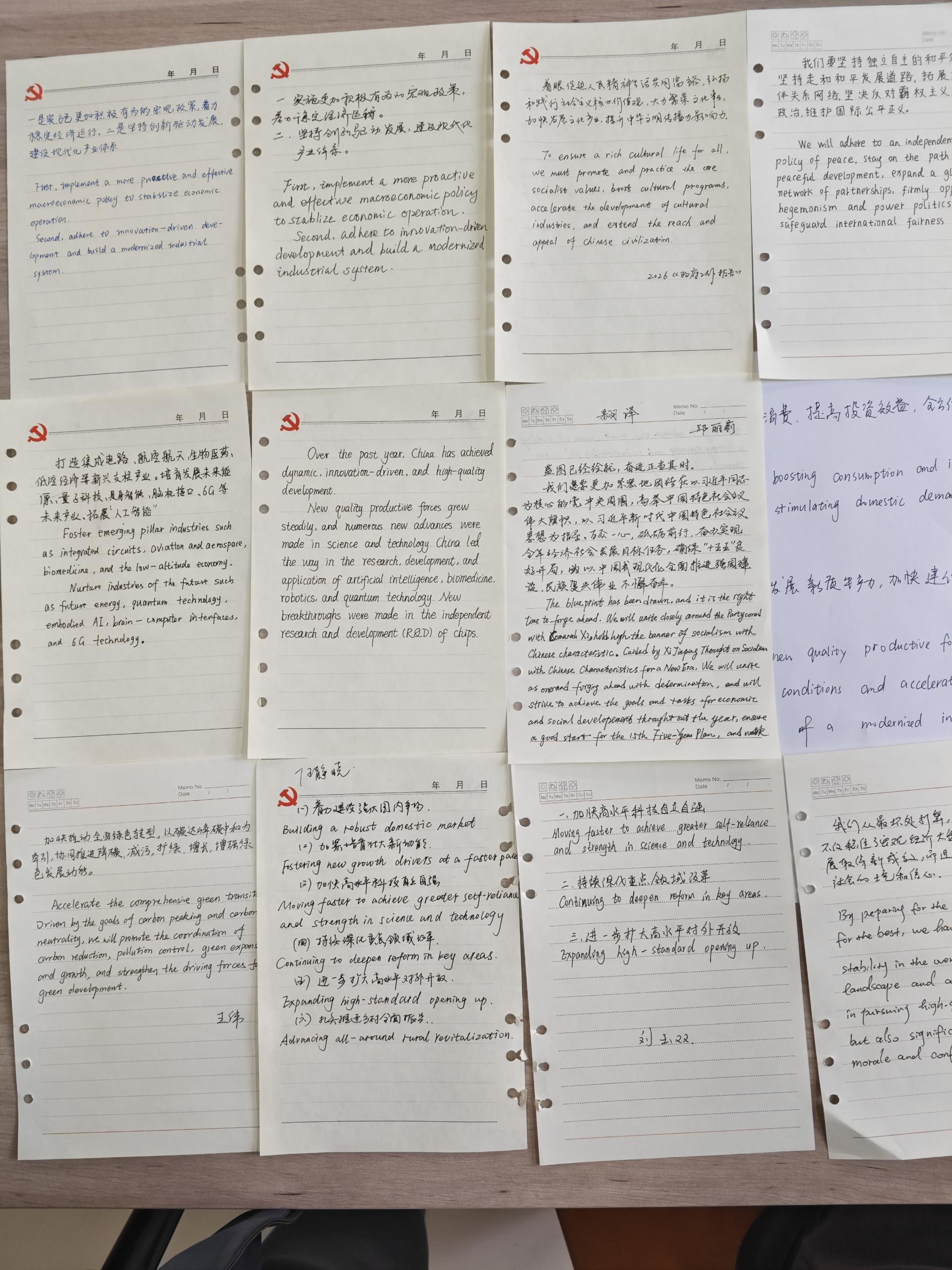 活动伊始,支部书记领学了2026年全国两会核心精神,围绕“高质量发展”、“民生保障”、“自立自强”等议题,解读了两会对高校人才培养、语言服务工作的新要求,强调以语言为桥,精准传递中国声音的重要意义。随后进入金句翻译环节,党员们选取《政府工作报告》中的金句,结合语境与翻译规范,开展精准翻译研讨。大家逐字推敲,兼顾政治准确性和语言表达力,分享翻译思路与技巧,在对比中深化对两会精神的领悟。
