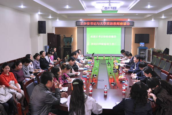 9月30日下午,校党委书记王少安到外语学院与担任2010级大学英语课程教学任务的近30位教师亲切座谈,党办、宣传部、教务处、研究生处负责同志及外语学院领导班子成员参加座谈。