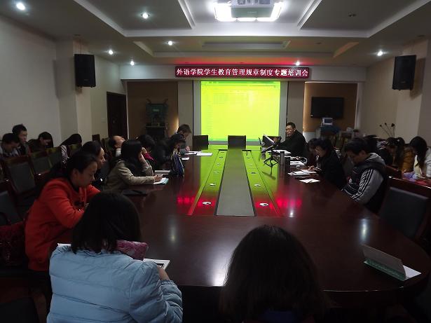 为了进一步贯彻落实学校近期出台的学生教育管理相关规章制度,11月18日下午,外国语学院在文科综合楼311会议室举行了学生教育管理规章制度专题培训会。培训会由外国语学院党委副书记王哲主持,全体辅导员、班主任以及各班班长和团支书参加了本次培训会。