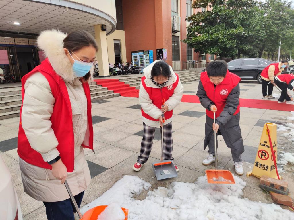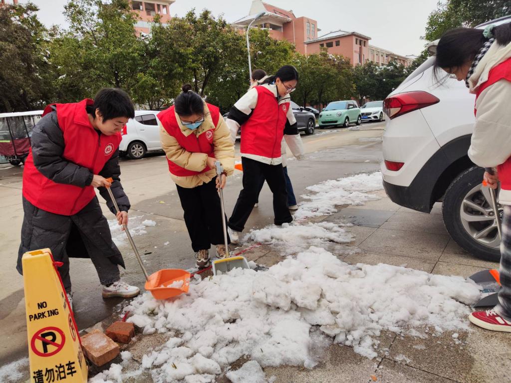 由于近期雨雪冰冻天气频繁,12月15日,为消除冰雪对学校教育教学活动的影响,确保师生出行顺畅,外国语学院组织本单位党员干部职工在文综楼前开展清雪除冰志愿服务活动,为安全和谐校园建设贡献一份力量。