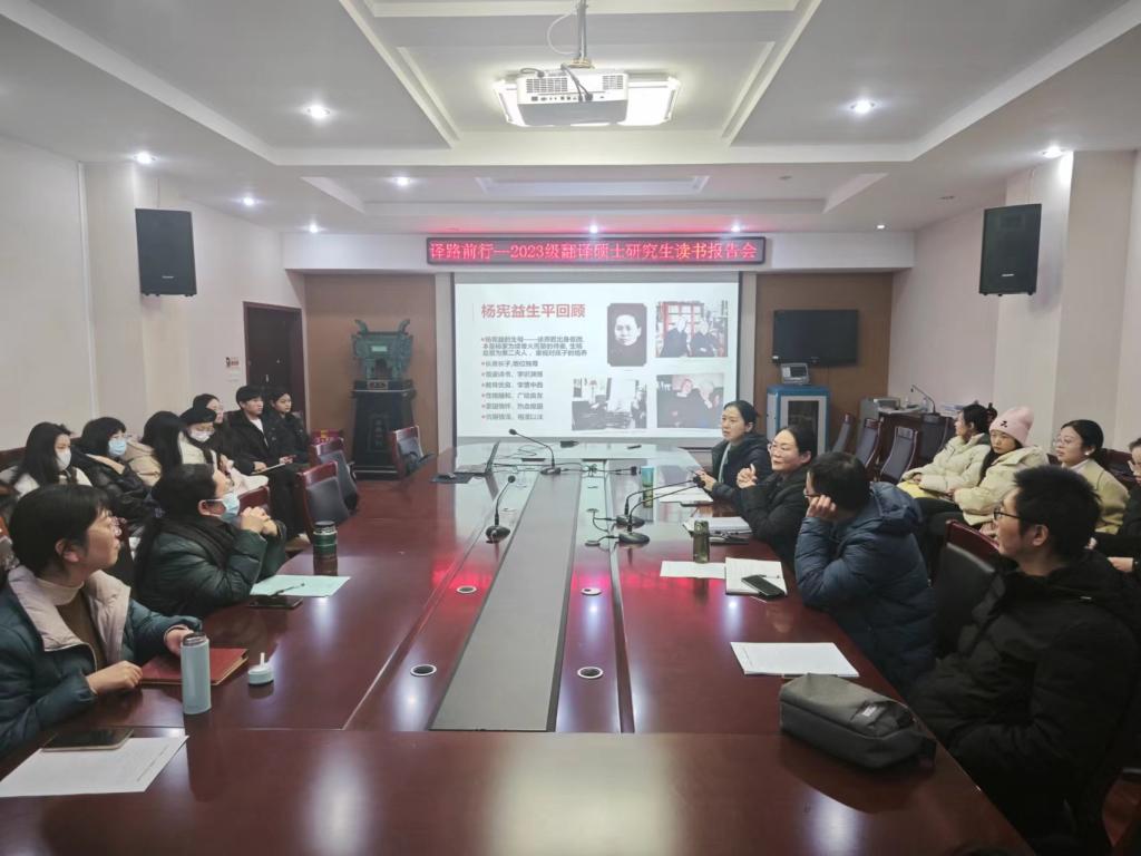 读书怡情,墨香润心。为进一步引导同学们养成“爱读书、会读书、读好书”的良好习惯,丰富同学们的知识储备,提高同学们的人文及专业素养,12月27号下午,我院在文综楼311会议室举办“译路前行——2023级翻译硕士读书报告会”活动。院长李惠敏、MTI中心主任冉玉体、全体MTI导师和翻译团队教师、以及2023级全体MTI研究生参加此次报告会,会议由冉玉体主持。
