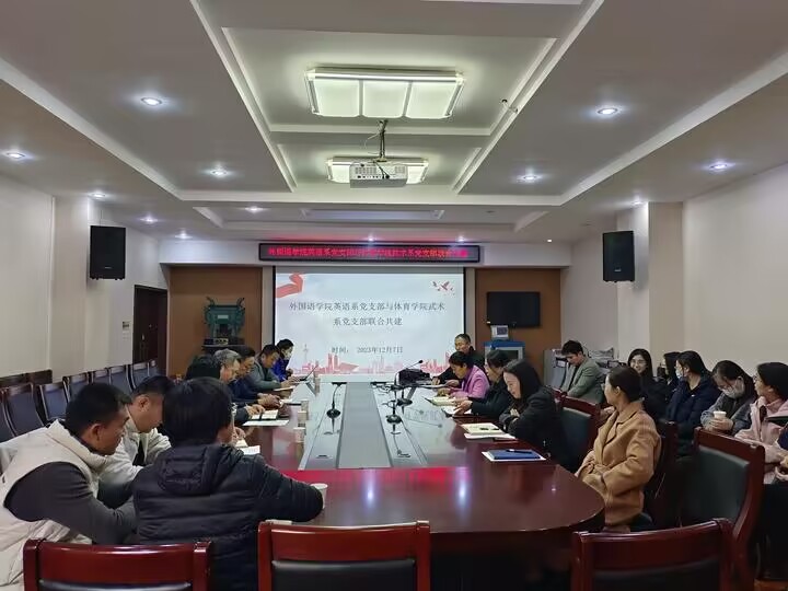 党建引领促融合,支部共建谋发展;太极搭桥增友谊,文武联手创未来。12月7日上午,我院英语系党支部与体育学院武术系党支部联合共建活动在文综楼311会议室召开。我院党委书记许荣梅、院长李惠敏、副院长吴敏,体育学院党委副书记马志洋、副院长王柏利及英语系党支部和武术系党支部党员代表参加了此次共建活动。活动由英语系党支部书记孙强主持。