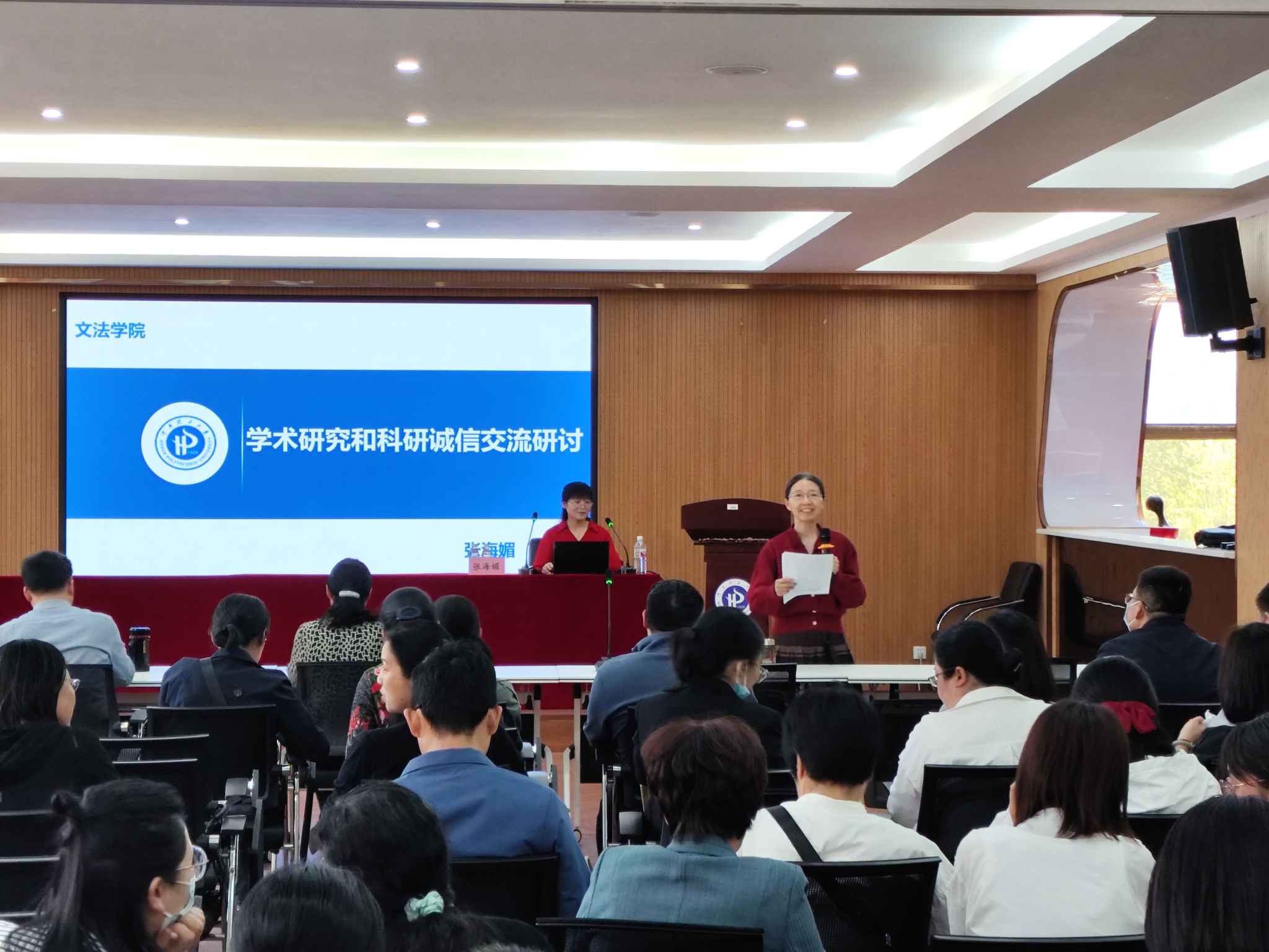 为有效推动学院的学术研究工作,为切实强化学院科研诚信工作,4月24日下午,我院在文综楼302会议室召开了学术研究与科研诚信讲座。本次讲座由文法学院张海媚教授主讲,全院教师参加,讲座由学院副院长李红教授主持。