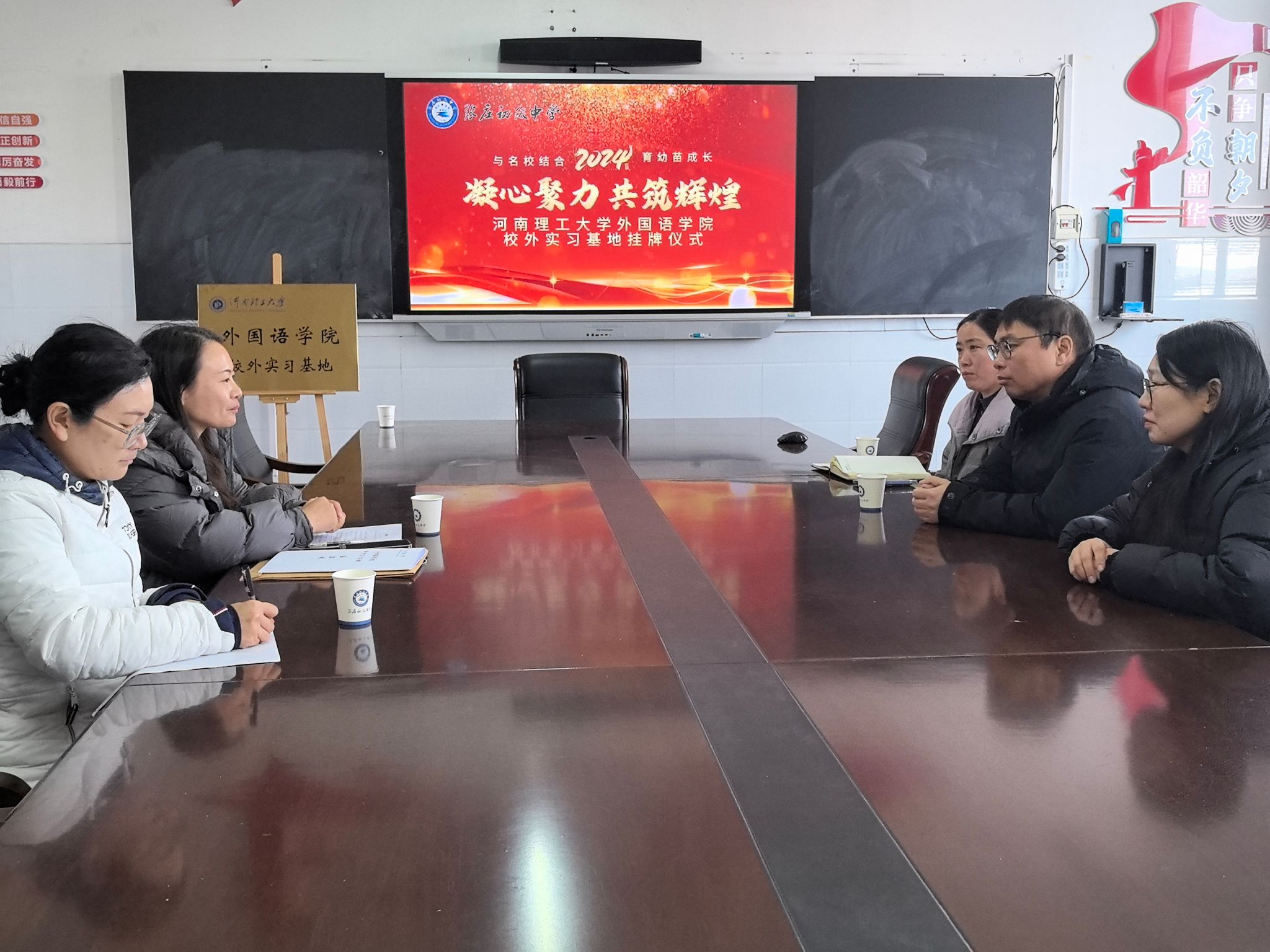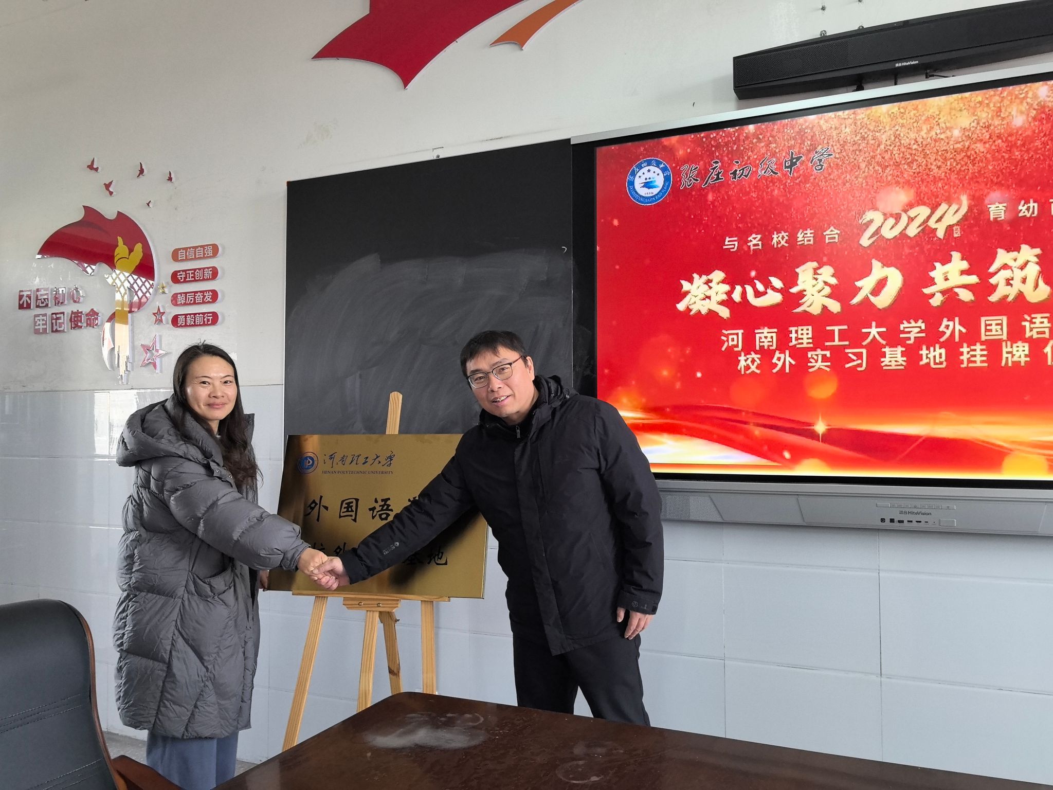 当日,双方签订了校外实习基地协议书,并举行了授牌仪式。本次签约授牌仪式进一步加强了河南理工大学外国语学院与张庄初中的联系合作。今后,双方将建立长期良性合作互动机制,更好地促进人才共育,实现高质量发展。