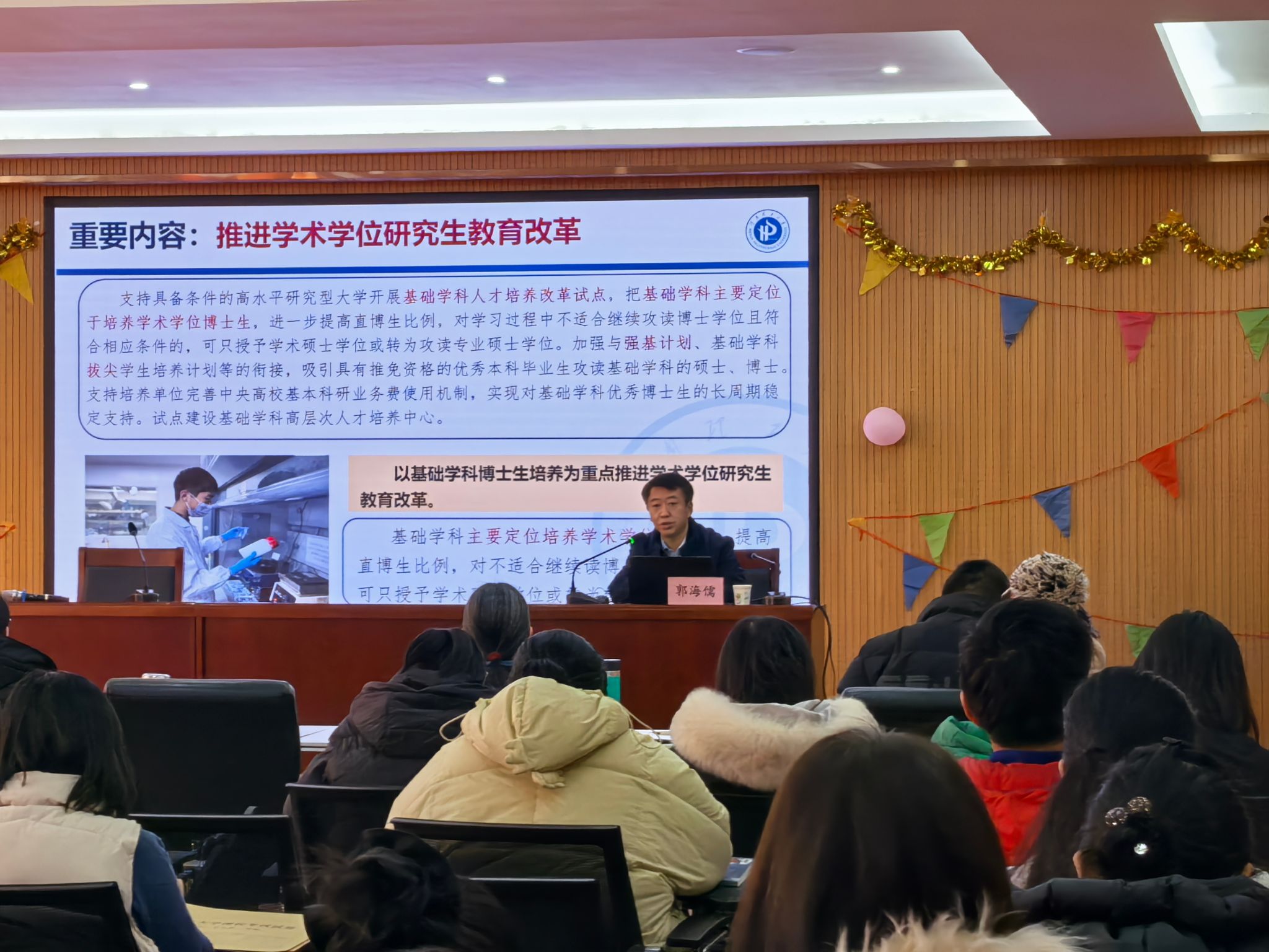 13日上午,发规处处长李东艳紧密结合外国语学院专业建设实际,作了题为《观大势谋长远,推进学科高质量内涵式发展》的专题讲座,讲座内容丰富详实,对开拓教师研究视野及外语学科发展具有积极的引领和助推作用;研究生院副院长郭海儒以《学习贯彻〈学位法〉,推进研究生教育高质量发展》为主题,展开了深入且全面的讲解,郭院长详细阐述了《学位法》的基本情况和主要内容,精准剖析了当下研究生教育面临的机遇和挑战,提出了研究生导师应具备的能力和素质,为我院的学位与研究生教育工作指明了方向。