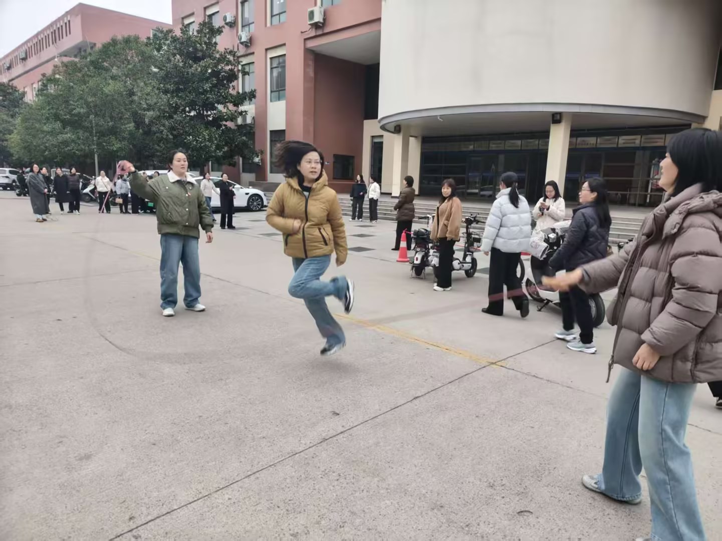 下午时分,平日里站在讲台上传道授业的“铿锵玫瑰”们脱下正装,换上轻便的运动装,齐聚文综楼前。随着长绳有节奏地甩动,活动现场瞬间沸腾起来。老师们一改课堂上的严肃,化身轻盈的“运动健将”。她们身姿矫健,穿梭在飞舞的长绳之间,有的身轻如燕,动作敏捷;有的配合默契,衔接流畅;即便偶有失误,也迅速调整状态,在彼此的加油鼓劲中继续投入。