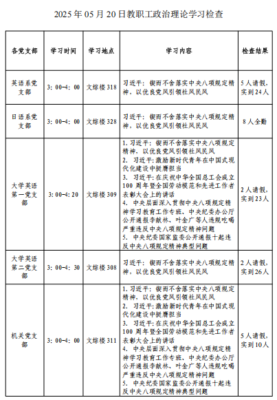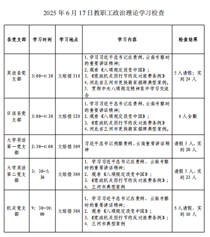 根据《外国语学院2025年上半年教职工理论学习计划》文件要求和工作安排,学院党委于5月20日、6月11日对各党支部教职工政治理论学习情况进行了全面检查,现将检查情况通报如下: