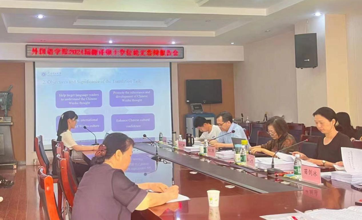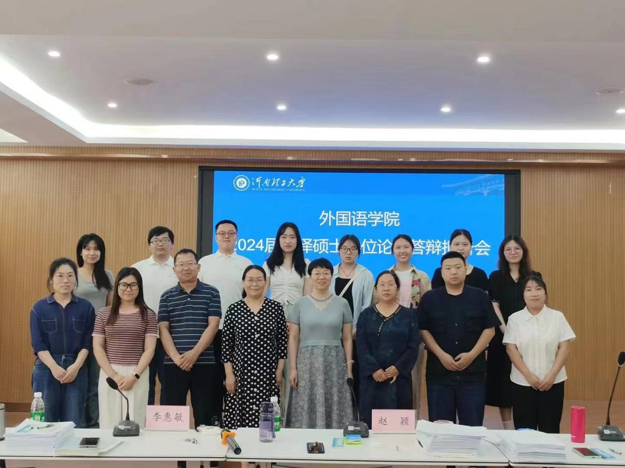 会上,参加答辩的同学首先进行论文陈述,内容主要包括论文选题目的及意义,论文大纲、主要理论依据、译例分析以及针对外审专家意见的修改情况;然后答辩委员会的各位老师根据论文内容向学生们提出问题和修改建议;学生们认真回答老师们的问题并记录修改意见;答辩委员会根据论文撰写及回答问题情况现场打分。最后,答辩委员会就答辩结果进行合议,并一致同意我院2024届翻译硕士的24名同学全部通过学位论文答辩。赵颖教授和赵文静教授代表答辩委员会表达了对各位同学通过毕业答辩的祝贺,对我院翻译硕士培养成果给予了充分肯定,并提醒同学们时刻保持严谨的学术态度,按照修改意见认真修改论文。
