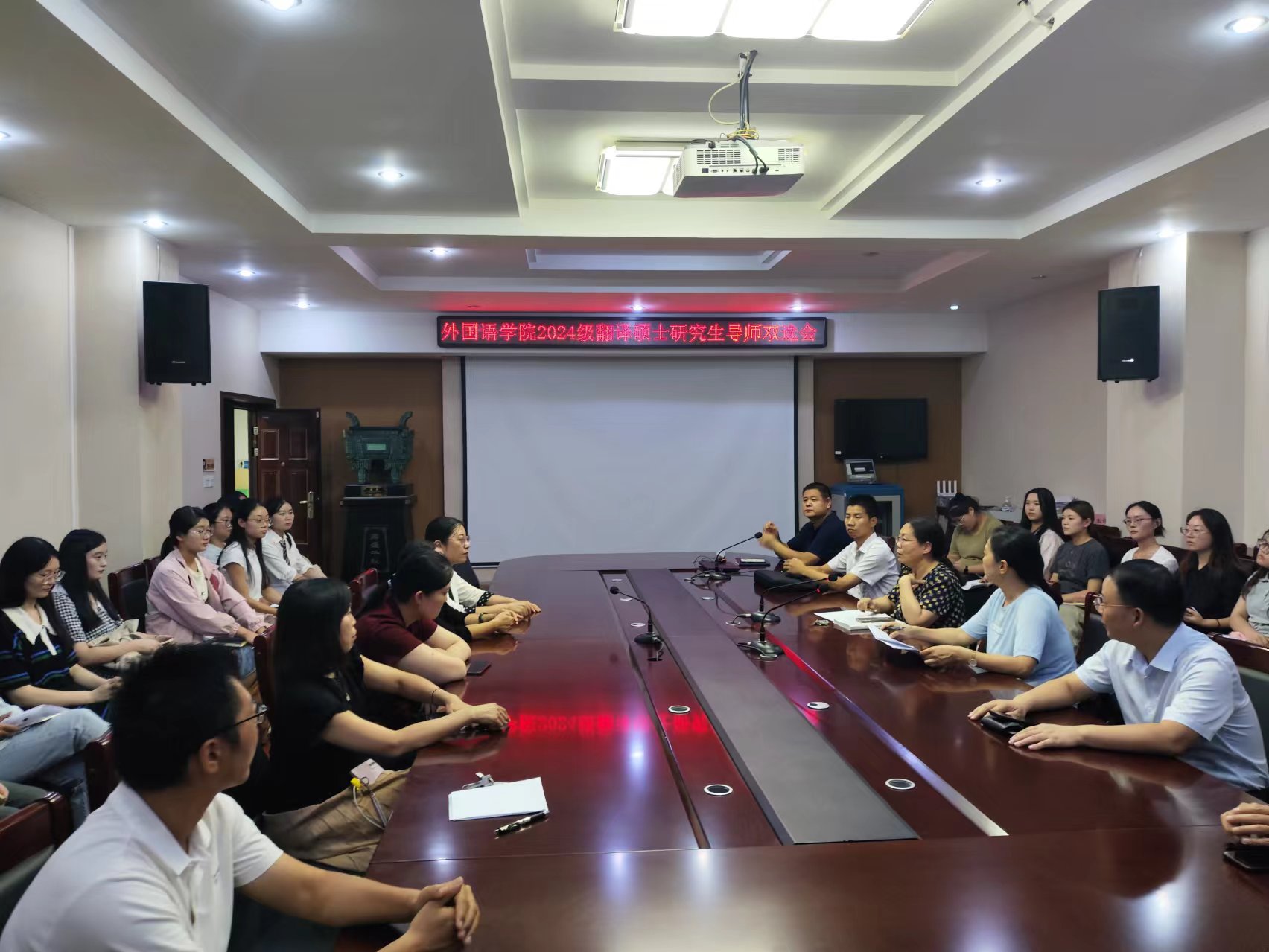 为加强导师对研究生的指导,切实提高研究生培养质量,9月19日晚上,外国语学院在文综楼311会议室召开翻译方向研究生和导师双向选择会。学院全体翻译方向硕士生导师、2024级翻译专业硕士生参加会议,会议由学院“翻译硕士(MTI)教育中心”主任冉玉体教授主持。