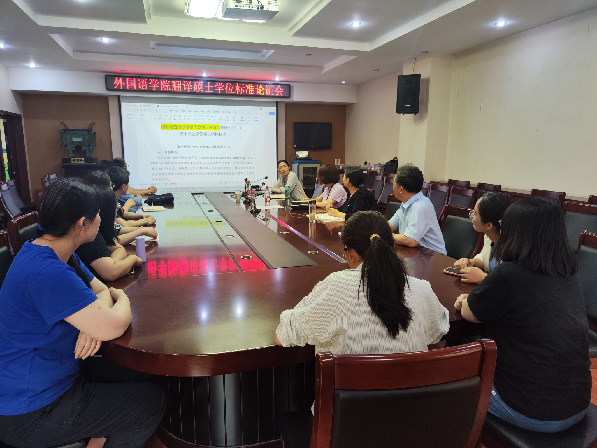 随后,冉玉体详细介绍了翻译硕士专业学位的培养目标、课程设置以及当前学位授予的现状与存在的问题,为后续讨论提供了全面的背景信息。与会导师结合自身的教学实践和研究经验,对学位标准的各个关键要素展开了深入讨论。会议最终达成了多项共识,形成了较为全面、系统的翻译硕士专业学位授予标准框架,为学院进一步完善学位管理制度、提高翻译硕士教育质量提供了坚实的基础。