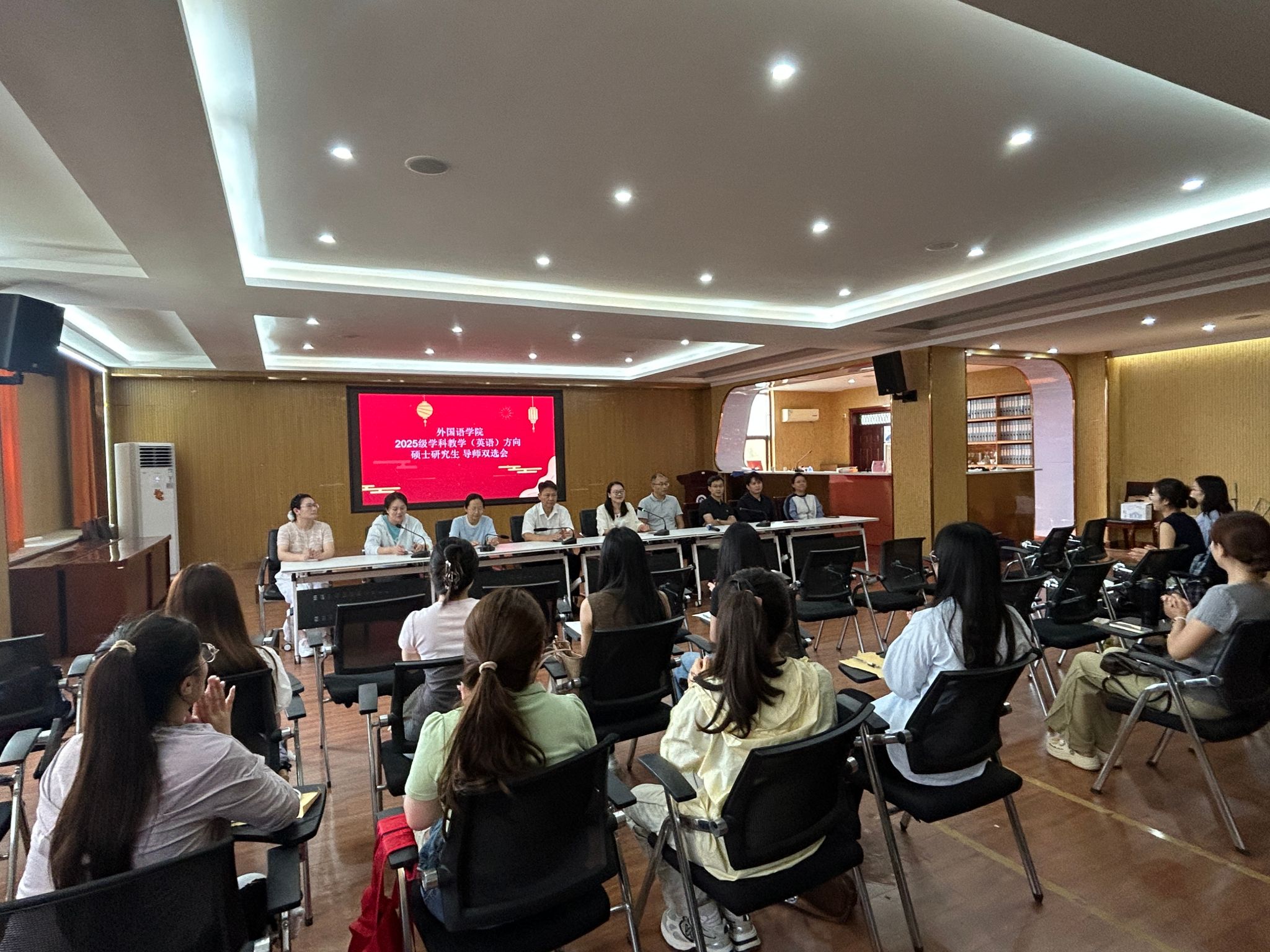 为充分发挥导师在研究生培养中的核心作用,搭建师生双向沟通的精准对接平台,9月13日下午,我院在文综楼302会议室召开了2025级学科教学(英语)方向硕士研究生导师双选会。会议由副院长吴敏主持,该方向的硕士生导师及2025级硕士研究生参加了会议,