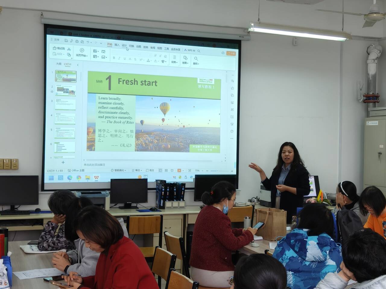 本次教研活动内容是大学英语第一单元内容,卜佑娟老师代表备课组进行了说课。第一单元以学生入学第一个月的生活为导入,让学生们讨论大学生活究竟意味着什么。接着,卜老师又从第一单元题材的角度切入,介绍了关于speech的相关知识。同时,卜老师还介绍了第一单元整体的教学内容安排以及U校园的使用注意事项。说课结束后,教研室老师们就课件内容和U校园使用过程中出现的问题开展了激烈的讨论并提出了一些可行的建议。