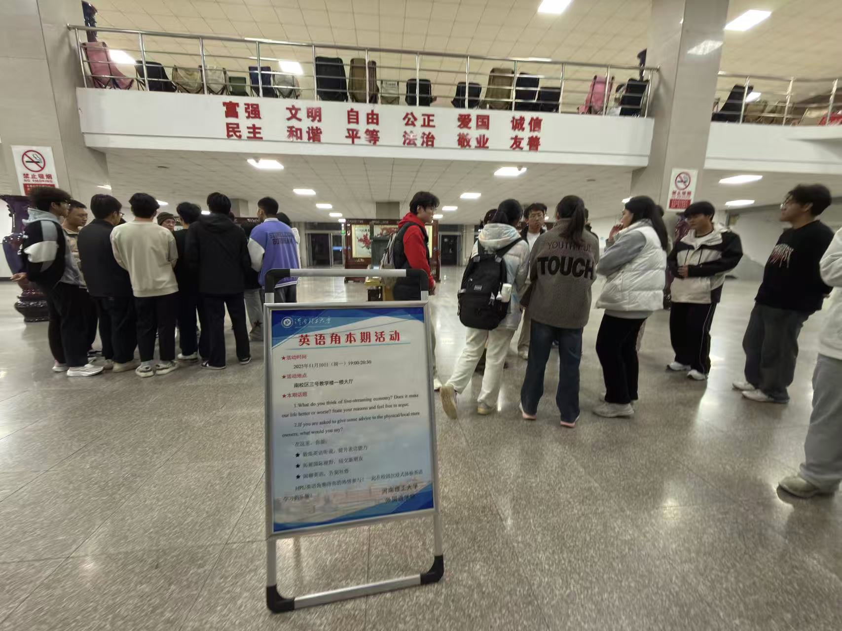 11月10日晚,由我院精心策划的英语角活动在南校区三号教学楼一楼大厅成功举行。本次活动以“Speaking English Loudly”为口号,吸引了来自全校各专业的百余名学子踊跃参与,现场气氛热烈,交流活跃,为初冬的校园注入了无限的活力与暖意。