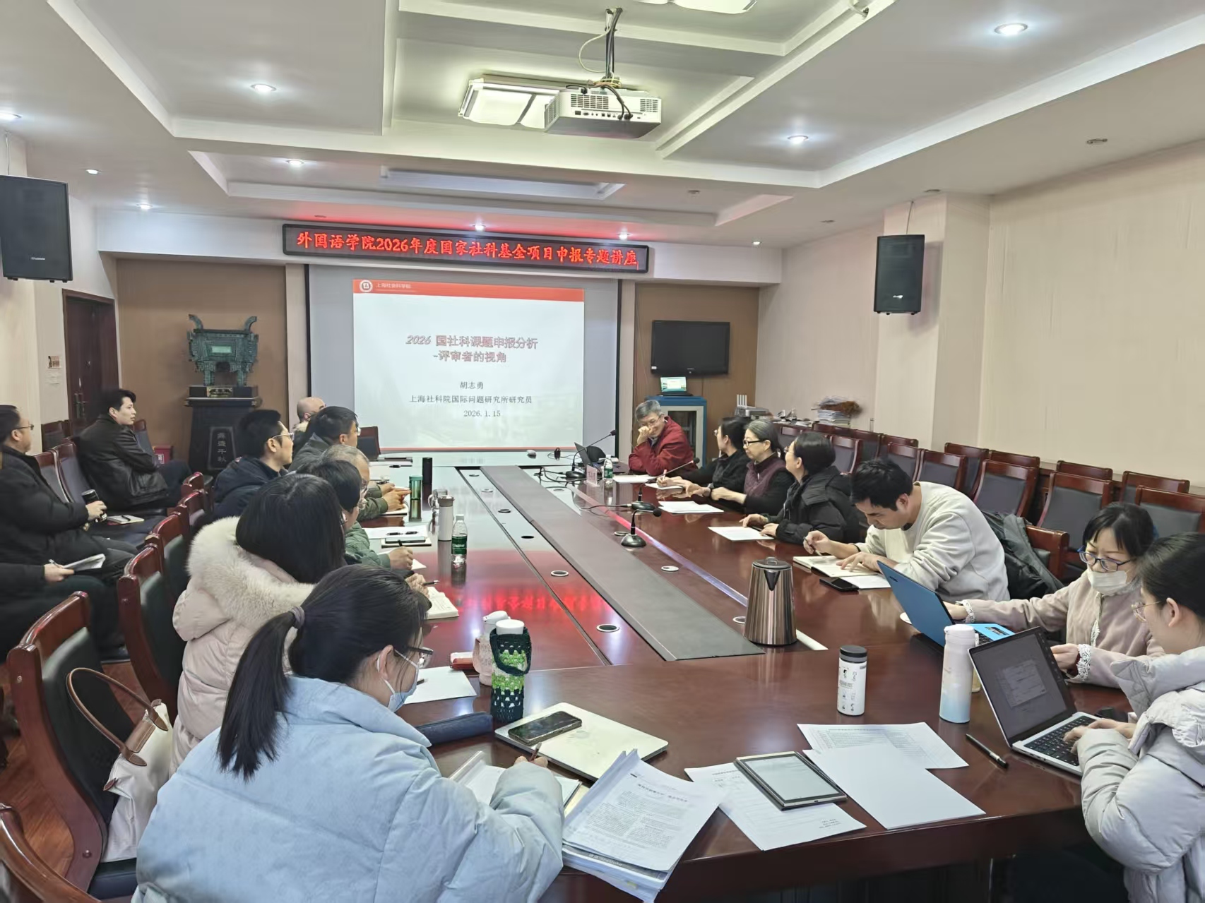 1月15日下午,我院在文综楼311会议室成功举办国家社科基金项目申报内容撰写辅导会。本次讲座特邀上海社会科学院国际问题研究所研究员胡志勇担任主讲,以“2026国社科课题申报分析-评审者的视角”为主题进行深入讲解。讲座由副院长李红主持,全院教师参加。