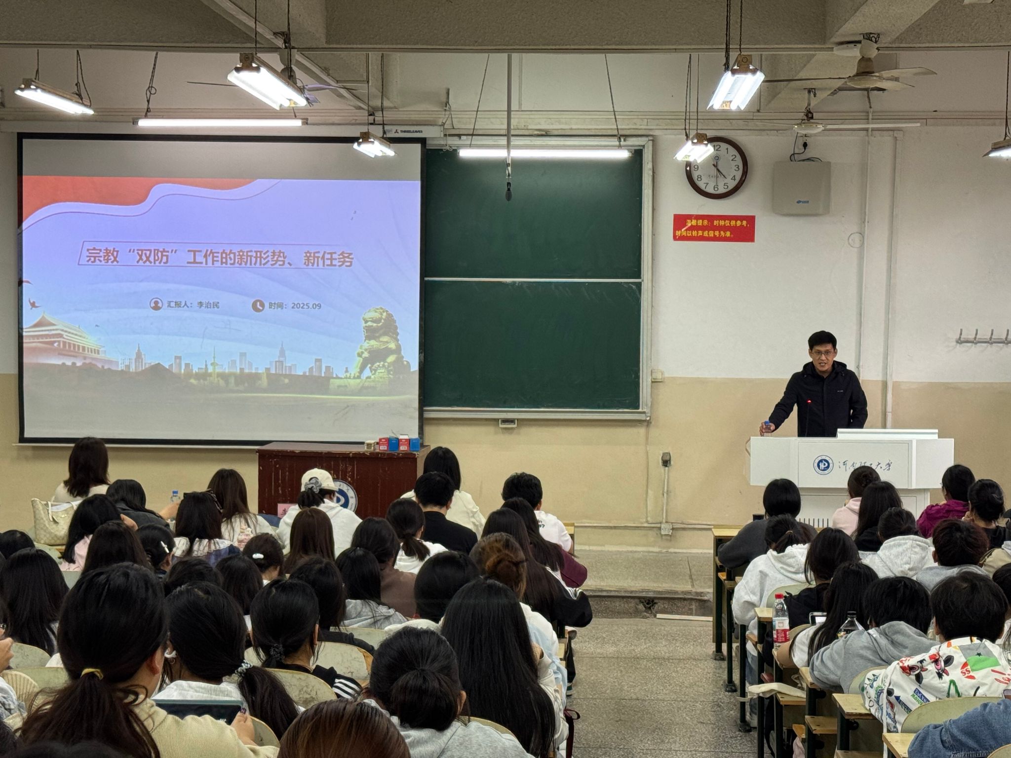 会上,李治民聚焦于高校民族宗教工作的新形势、新任务,围绕“是什么”“为什么”“怎么做”做了系统阐述。他结合大学生实际,详细讲解了民族宗教相关政策法规,强调全体学生应牢记 “五个严禁”,教育引导学生牢固树立正确的民族观、宗教观,做到绷紧弦、守底线,知本质、守法律。