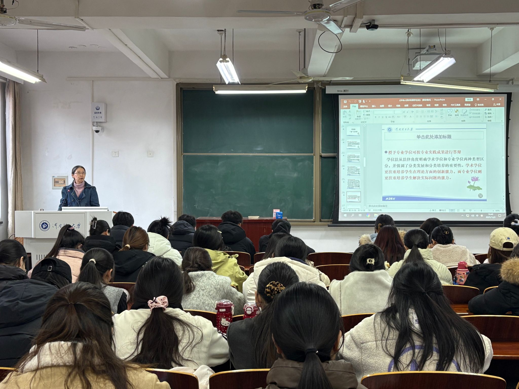 为深入贯彻落实《研究生学位法》相关规定,强化研究生学术规范意识,涵养求真务实的优良学风,12月2日下午,文综楼306教室成功举办了以“筑牢学术根基 涵养优良学风”为主题的学位法和学风道德宣讲会,外国语学院副院长李红主讲,我院2025级全体研究生参加了此次报告会。