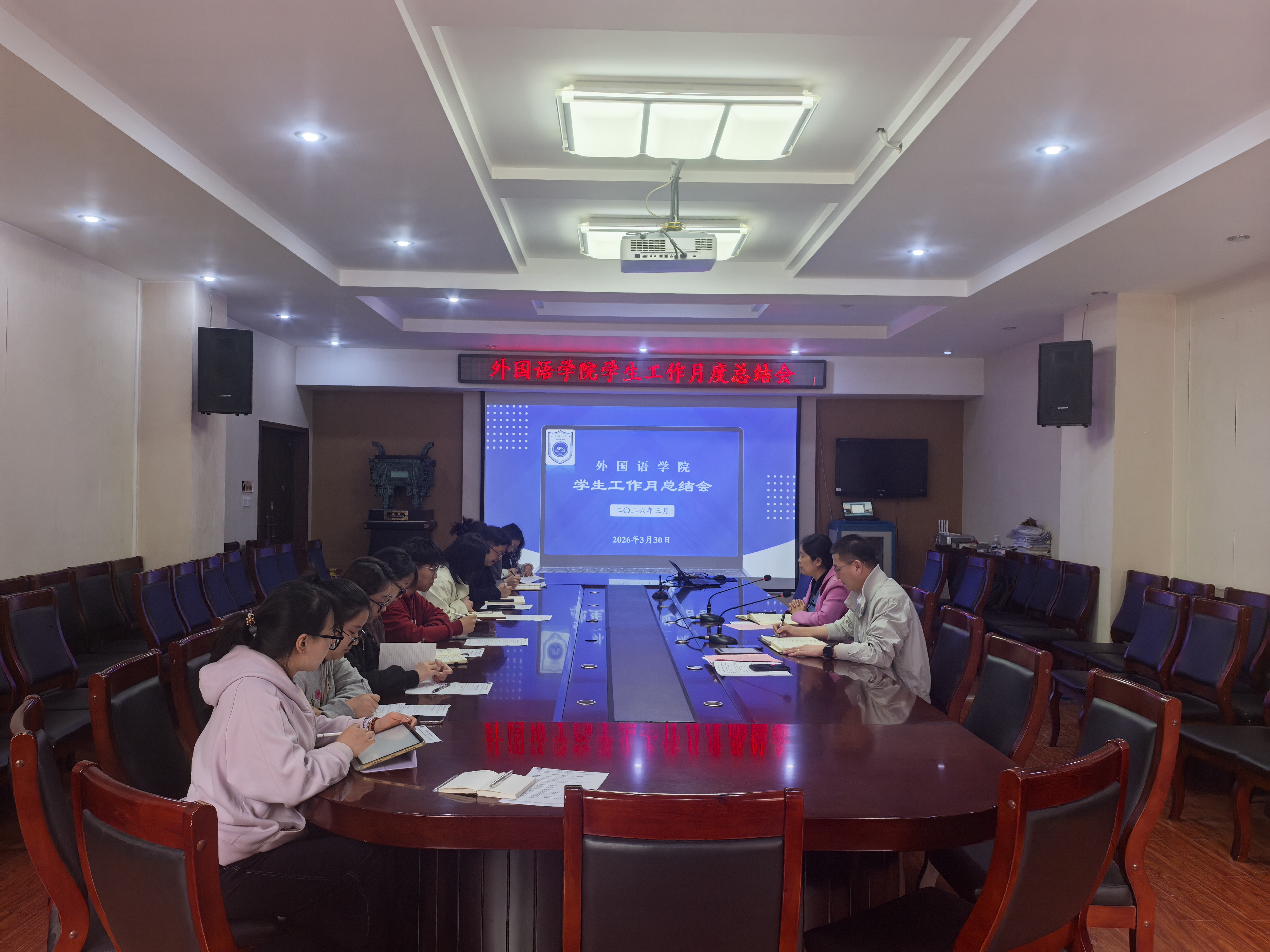 为全面总结3月份工作成果成效,精准梳理问题和不足,科学谋划4月份的重点任务,3月30日上午,我院2026年3月份学生工作月度总结会在文综楼311会议室召开。院党委书记许荣梅出席会议,院团委书记、学工办副主任、全体专兼职辅导员、学生助理(助管)及各院属学生组织的主要负责人参加会议,会议由院党委副书记何军主持。
